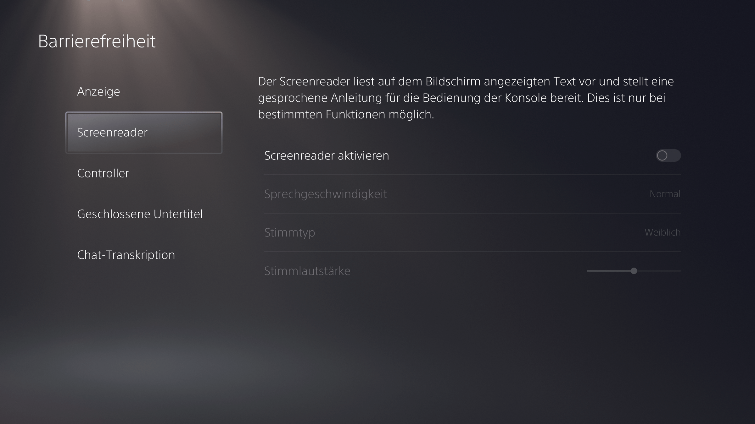 - Der Screenreader liest auf dem Bildschirm angezeigten Text vor und stellt eine gesprochene Anleitung für die Bedienung der Konsole bereit. Dies ist nur bei bestimmten Funktionen möglich.