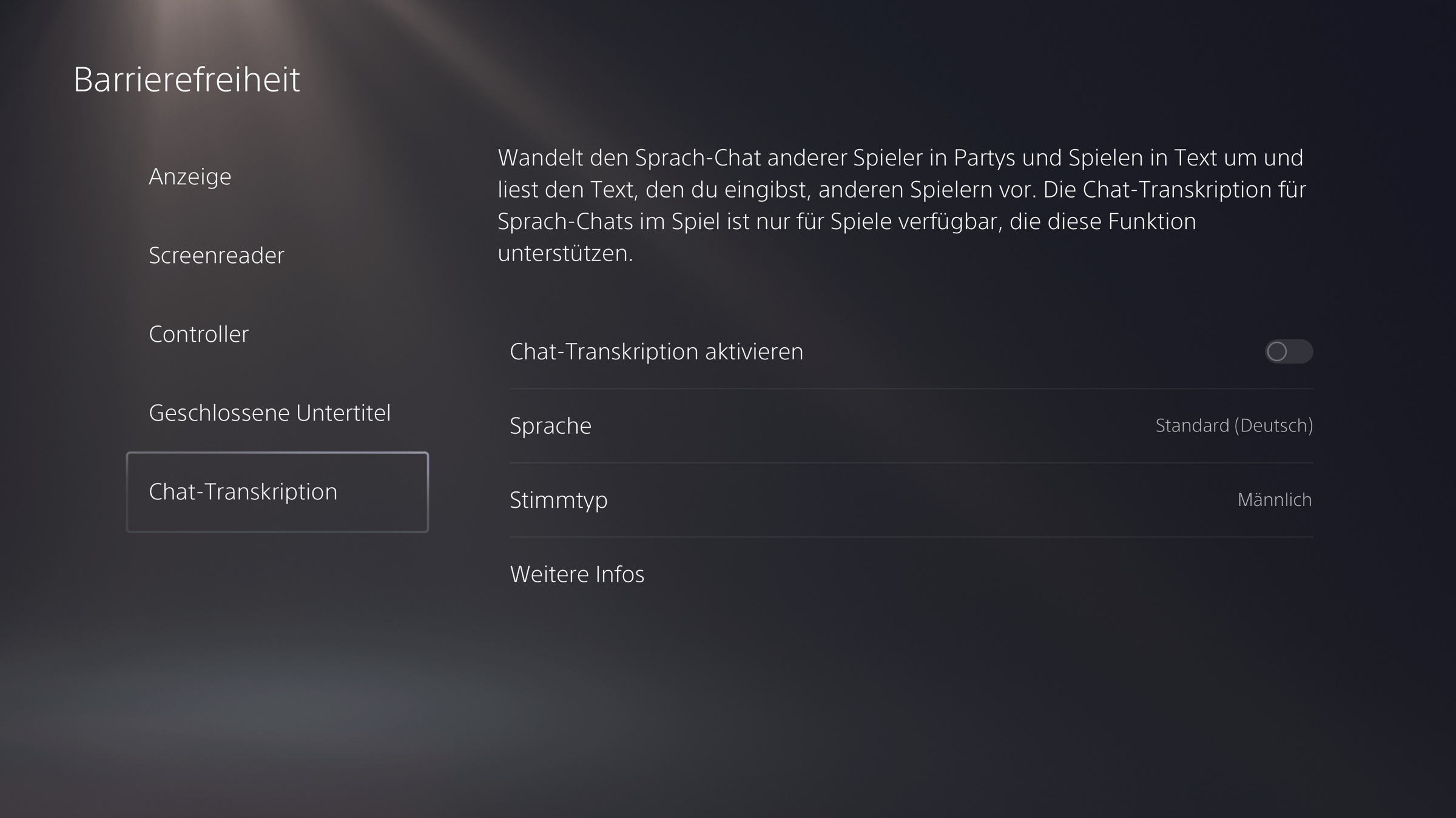 - Wandelt den Sprach-Chat anderer Spieler in Partys und Spielen in Text um und liest den Text, den du eingibst, anderen Spielern vor. Die Chat-Transkription für Sprach-Chats im Spiel ist nur für Spiele verfügbar, die diese Funktion unterstützen.