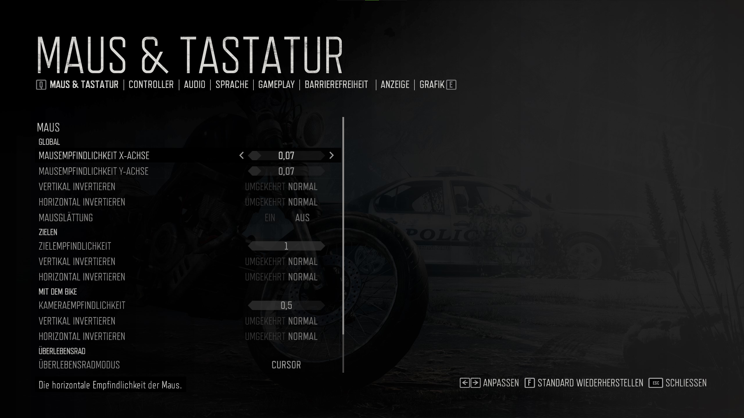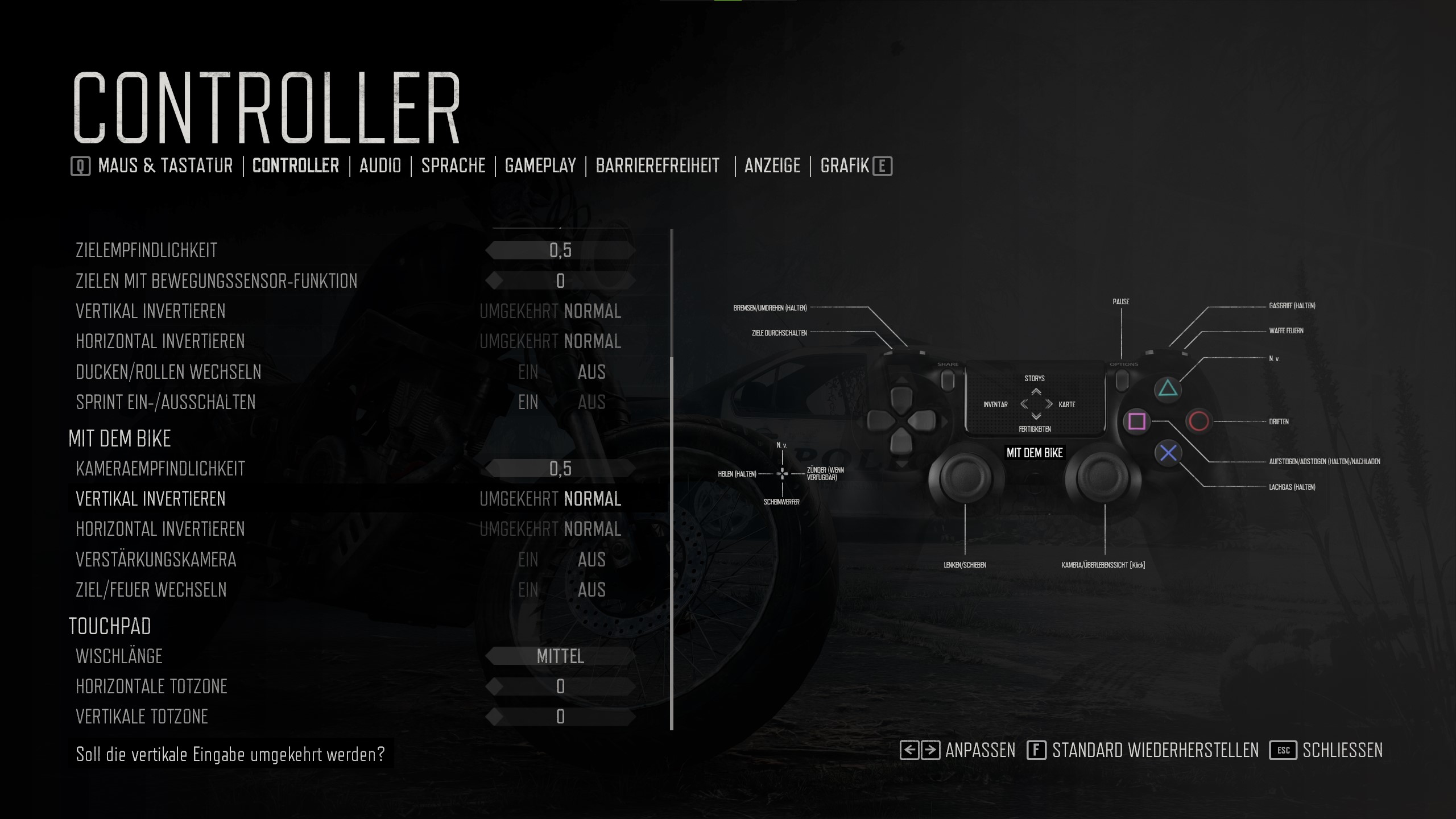 Ihr könnt für das Motorrad die Kamera Empfindlichkeit anpassen, die vertikale und horizontale Lenkung invertieren und den Überlebensrad-Modus anpassen.
