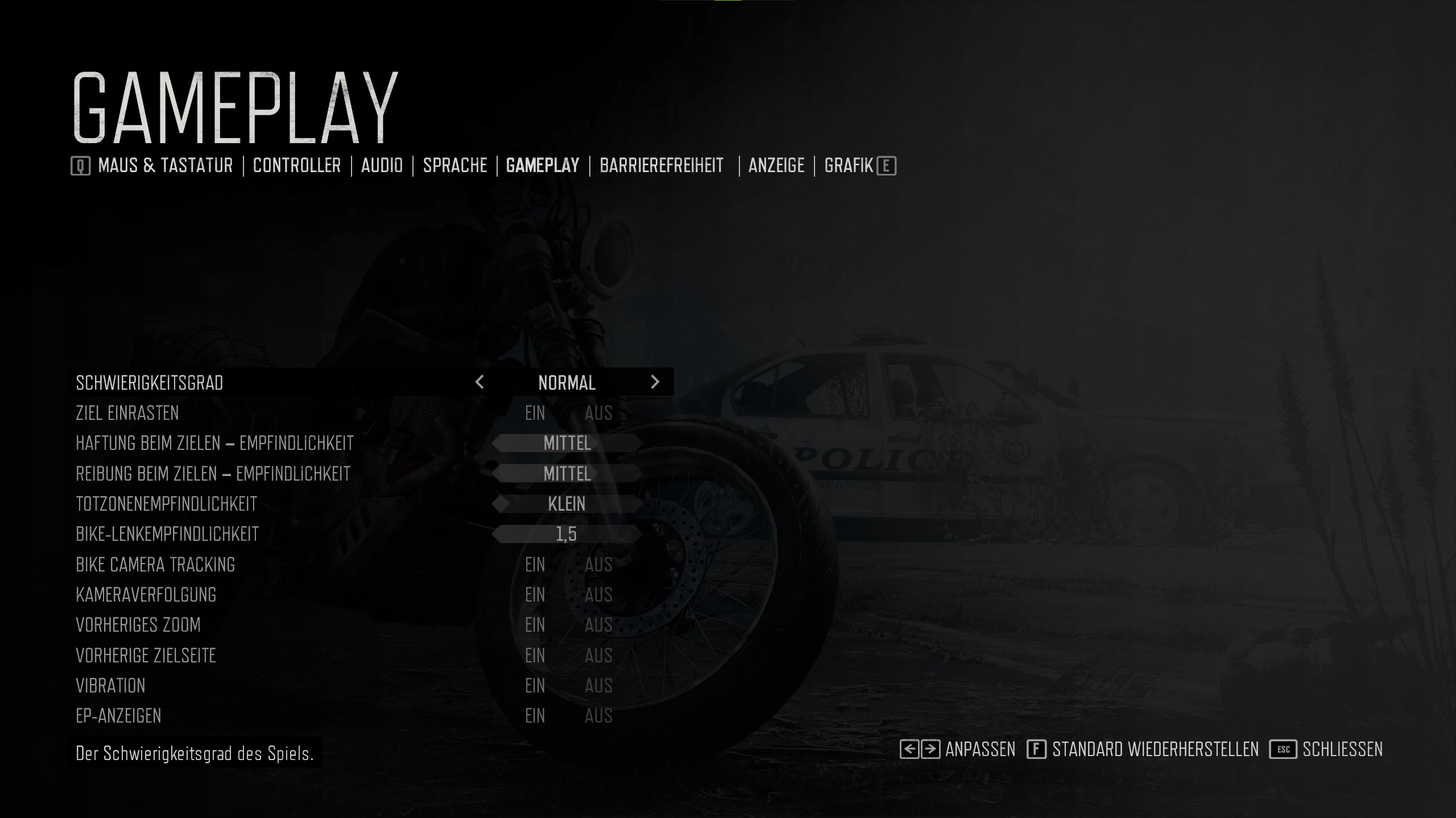Ihr könnt bei den Gameplay-Optionen die Schwierigkeit anpassen, Ziel einrasten an oder ausschalten, die Haftung beim Zielen - Empfindlichkeit, Reibung beim Zielen - Empfindlichkeit, Totzonen-Empfindlichkeit und Motorrad-Lenk-Empfindlichkeit anpassen.