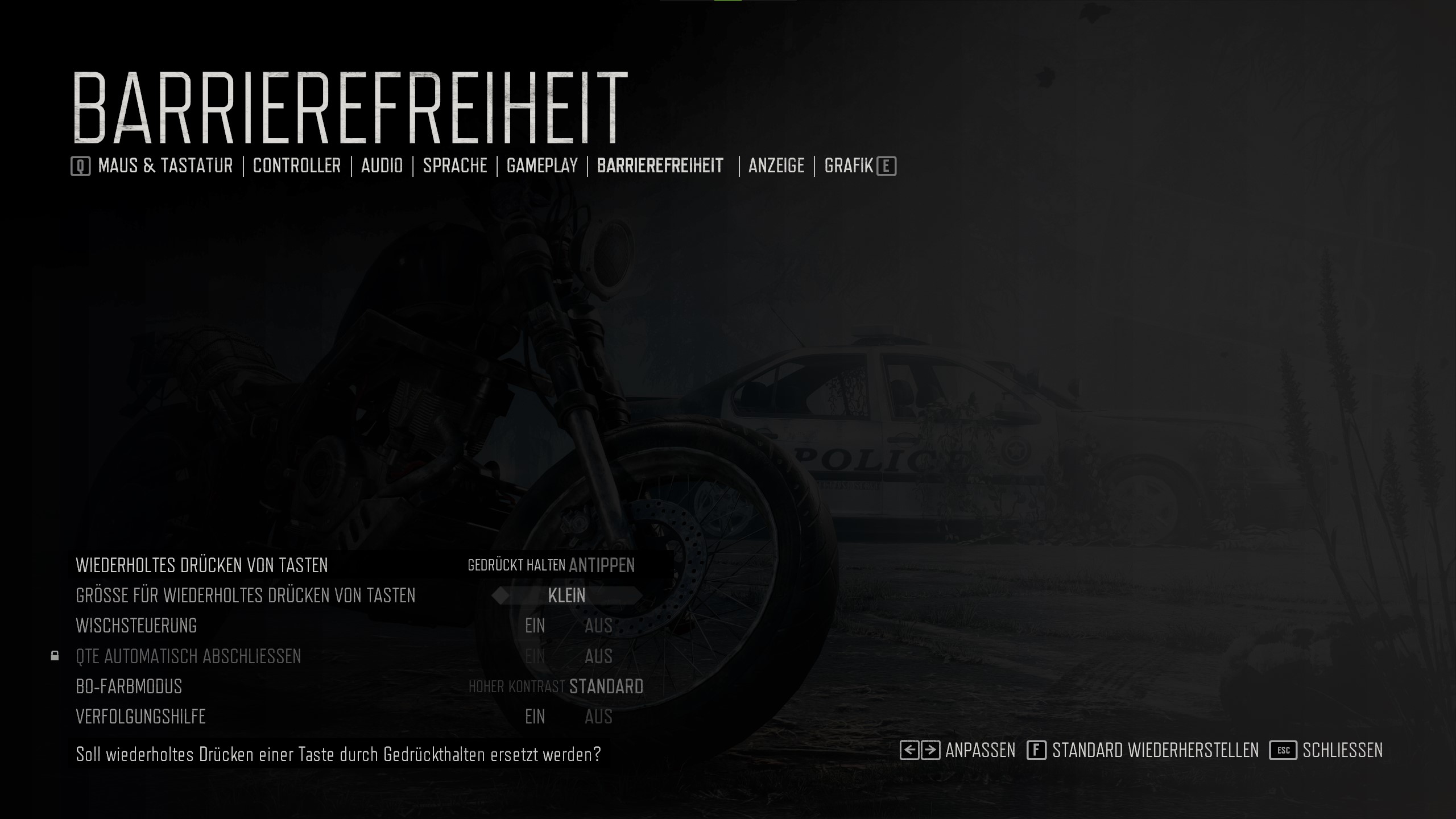 In den Barrierefreiheit-Optionen könnt ihr wiederholtes Drücken von Tasten auf „gedrückt halten“ oder „antippen“ stellen und die Größe für wiederholtes Drücken von Tasten anpassen. Zudem könnt ihr die Wischsteuerung, Quick-Time-Events (QTE) automatisch abschließen an oder ausschalten, den BD-Farbmodus auf „hoher Kontrast“ oder „Standard“ stellen und die Verfolgungshilfe an oder ausschalten.