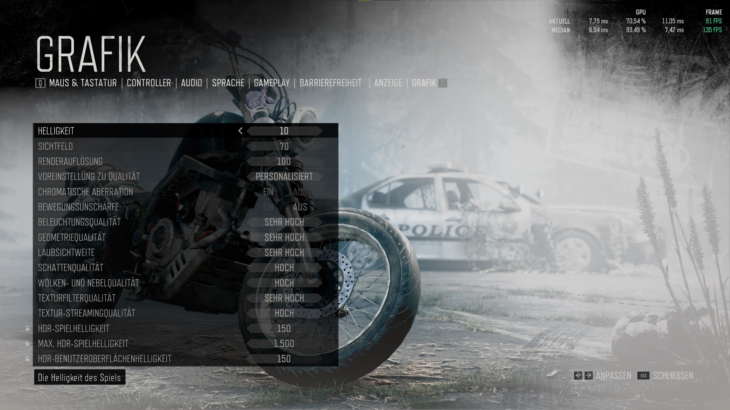 Unter den Grafik-Optionen könnt ihr die Helligkeit, das Sichtfeld und die Renderauflösung anpassen, Voreinstellungen zu Qualität laden, chromatische Aberration und Bewegungsunschärfe an oder ausschalten, Beleuchtungs-Qualität, Geometriequalität, Laub-Sichtweite, Schatten-Qualität, Wolken und Nebel-Qualität, Texturfilter-Qualität, Textur-Streaming-Qualität, HDR-Spiel-Helligkeit, max. HDR-Spiel-Helligkeit und HDR-Benutzeroberflächen-Helligkeit anpassen.