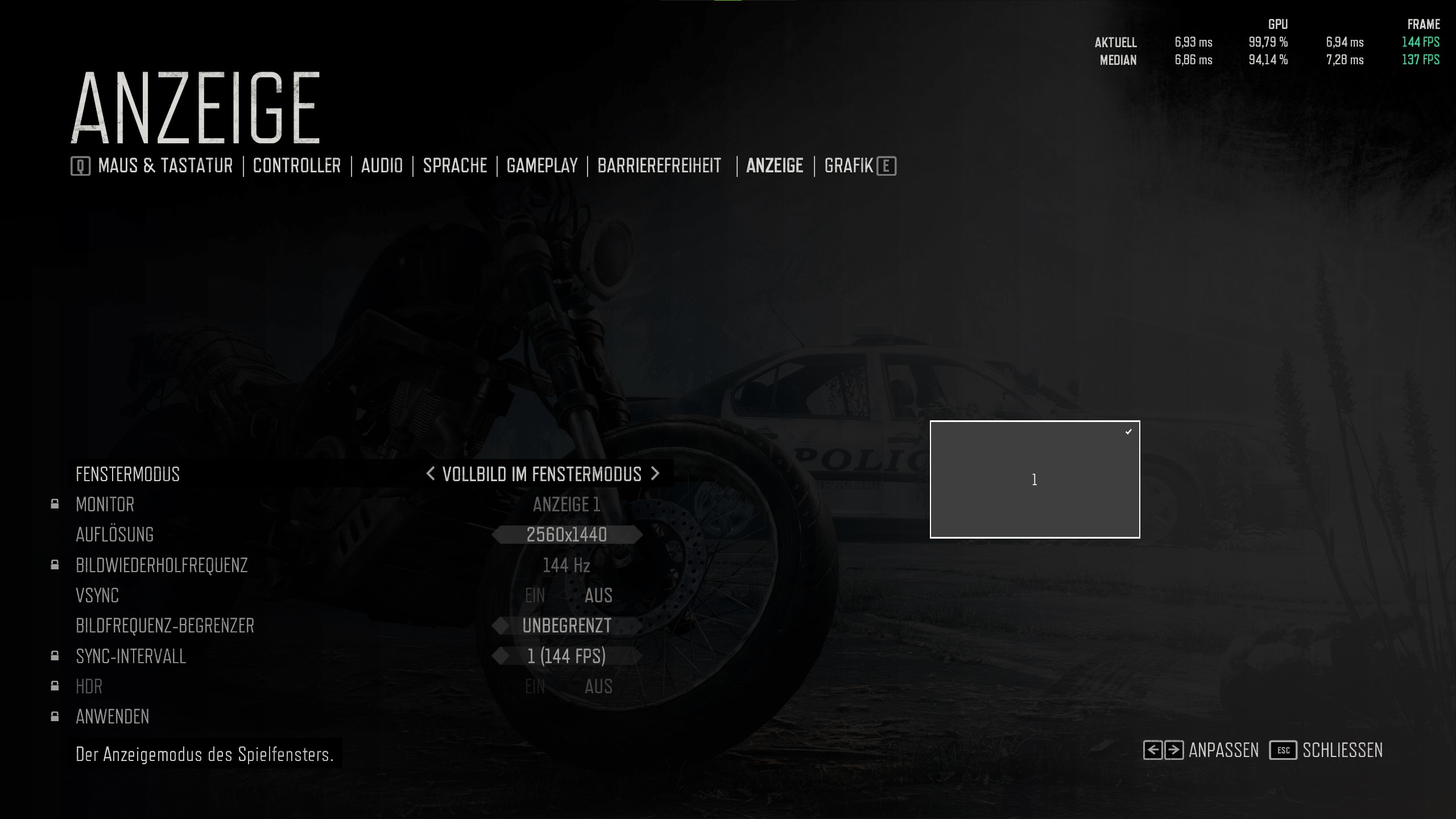 Außerdem könnt Ihr den Monitor wechseln, die Auflösung, Bildwiederhol-Frequenz, Bildfrequenz-Begrenzer und Sync-Intervall anpassen, VSync und HDR an oder ausschalten.
