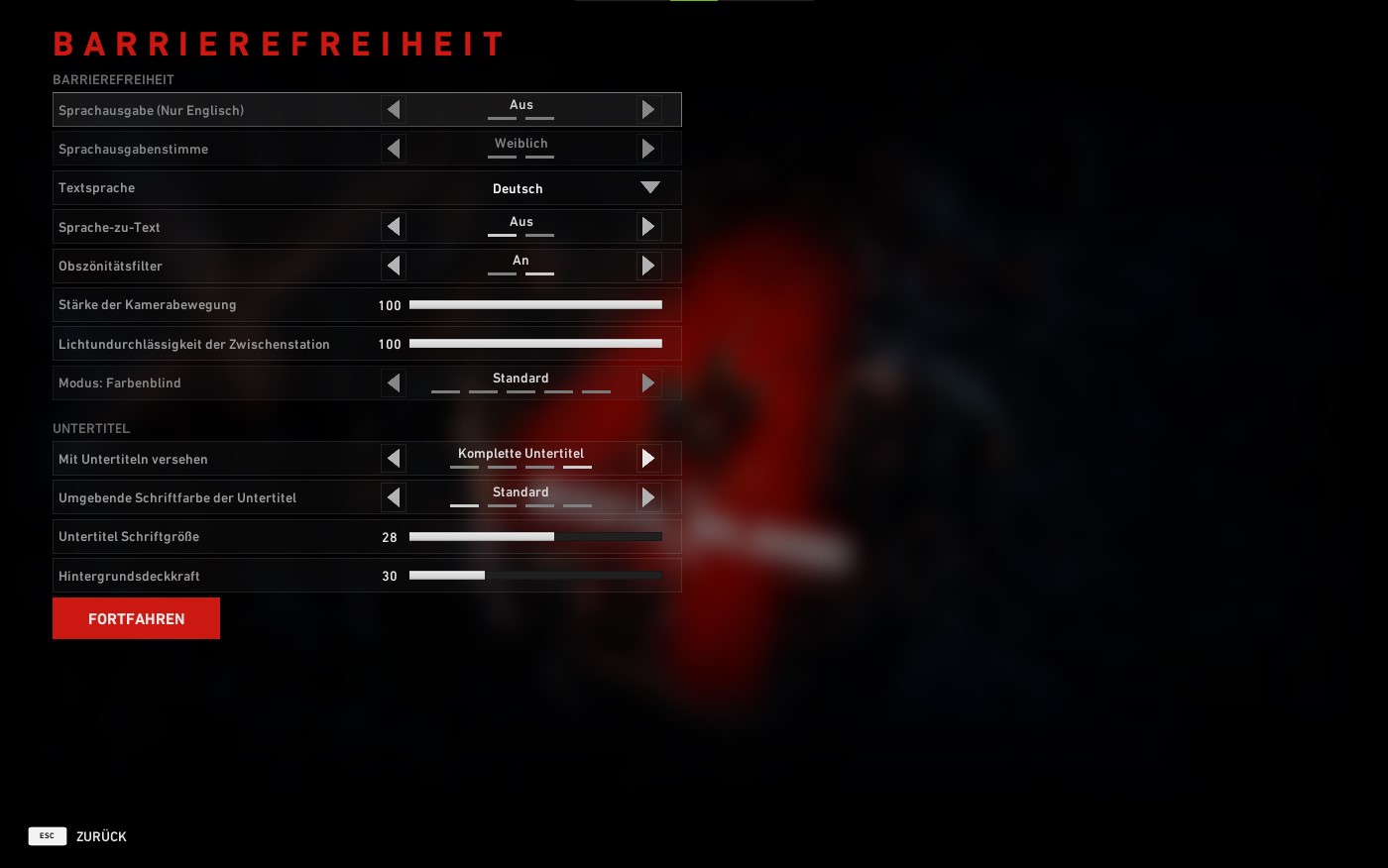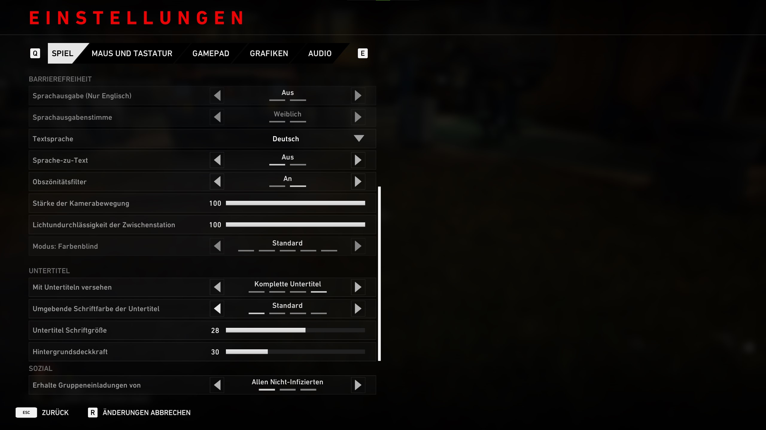Außerdem könnt ihr unter Barrierefreiheit die Sprachausgabe (Aktuell nur in Englisch) an- oder ausschalten, die Stimme der Sprachausgabe auf weiblich oder männlich ändern, die Textsprache anpassen, Sprache-zu-Text und Obszönitätsfilter an- oder ausschalten, die Stärke der Kamerabewegung, Lichtundurchlässigkeit der Zwischenstation und der Farbenblinden-Modus anpassen.