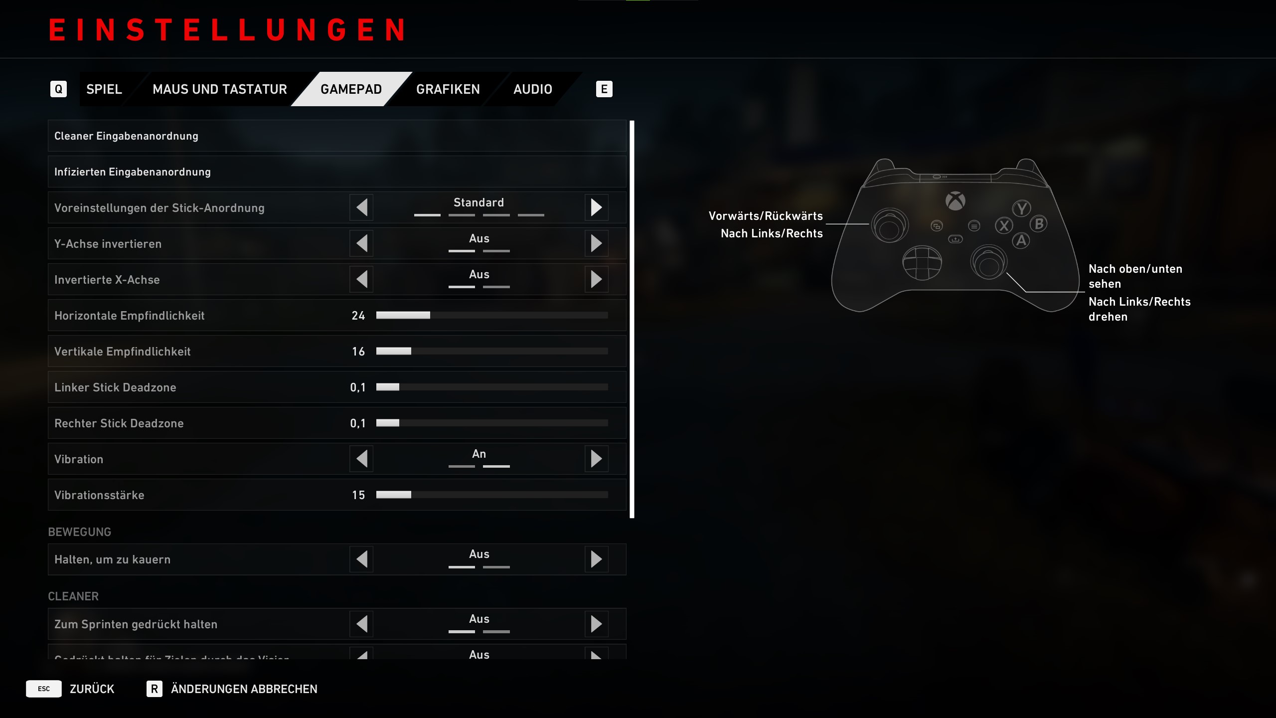 Links könnt ihr die Cleaner- und Infizierten-Eingabeanordnung anpassen, Voreinstellungen der Stick-Anordnung wählen, die Y- und X-Achse invertieren, die Horizontale- und Vertikale-Empfindlichkeit und die Deadzone vom Linken- und Rechten-Stick anpassen, die Vibration an- oder ausschalten, die Vibrationsstärke anpassen, halten, um zu kauern und zum Sprinten gedrückt halten an- oder ausschalten.