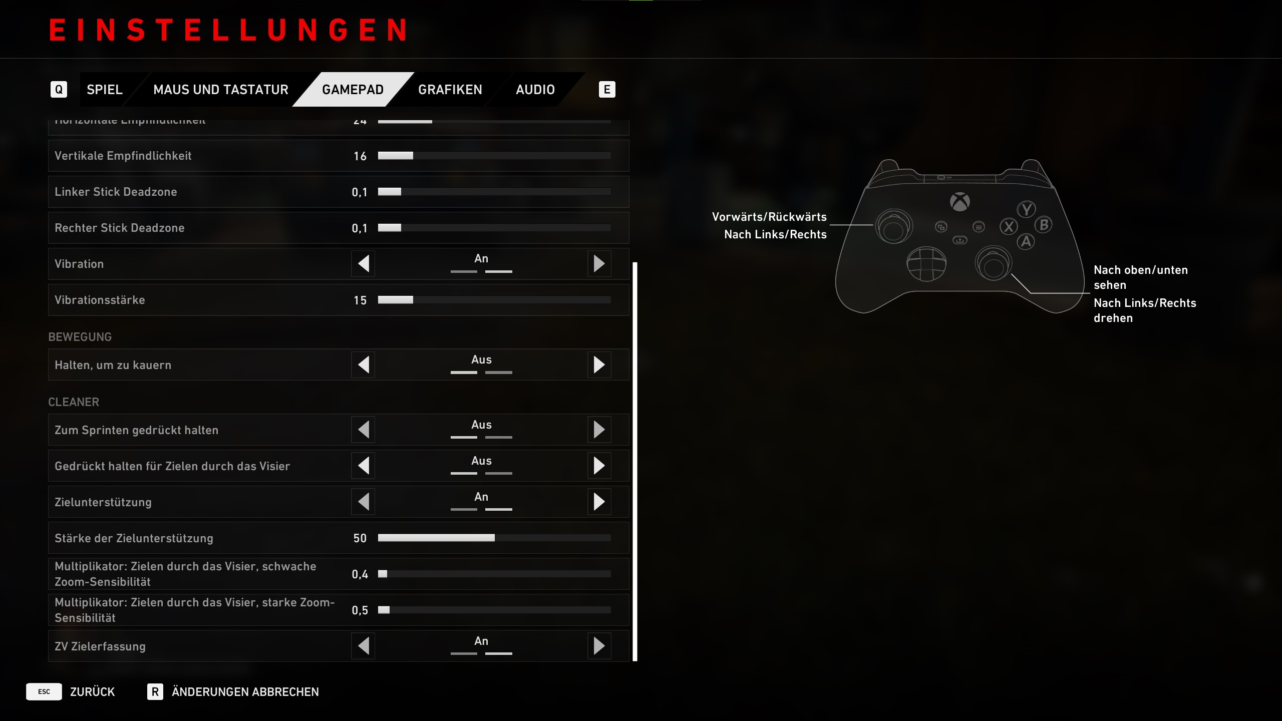 Außerdem könnt ihr gedrückt halten für Zielen durch das Visier und die Zielunterstützung an- oder ausschalten, die Stärke der Zielunterstützung und den Multiplikator: Zielen durch das Visier, schwache- und starke Zoom Sensibilität anpassen und die ZV Zielerfassung an- oder ausschalten.