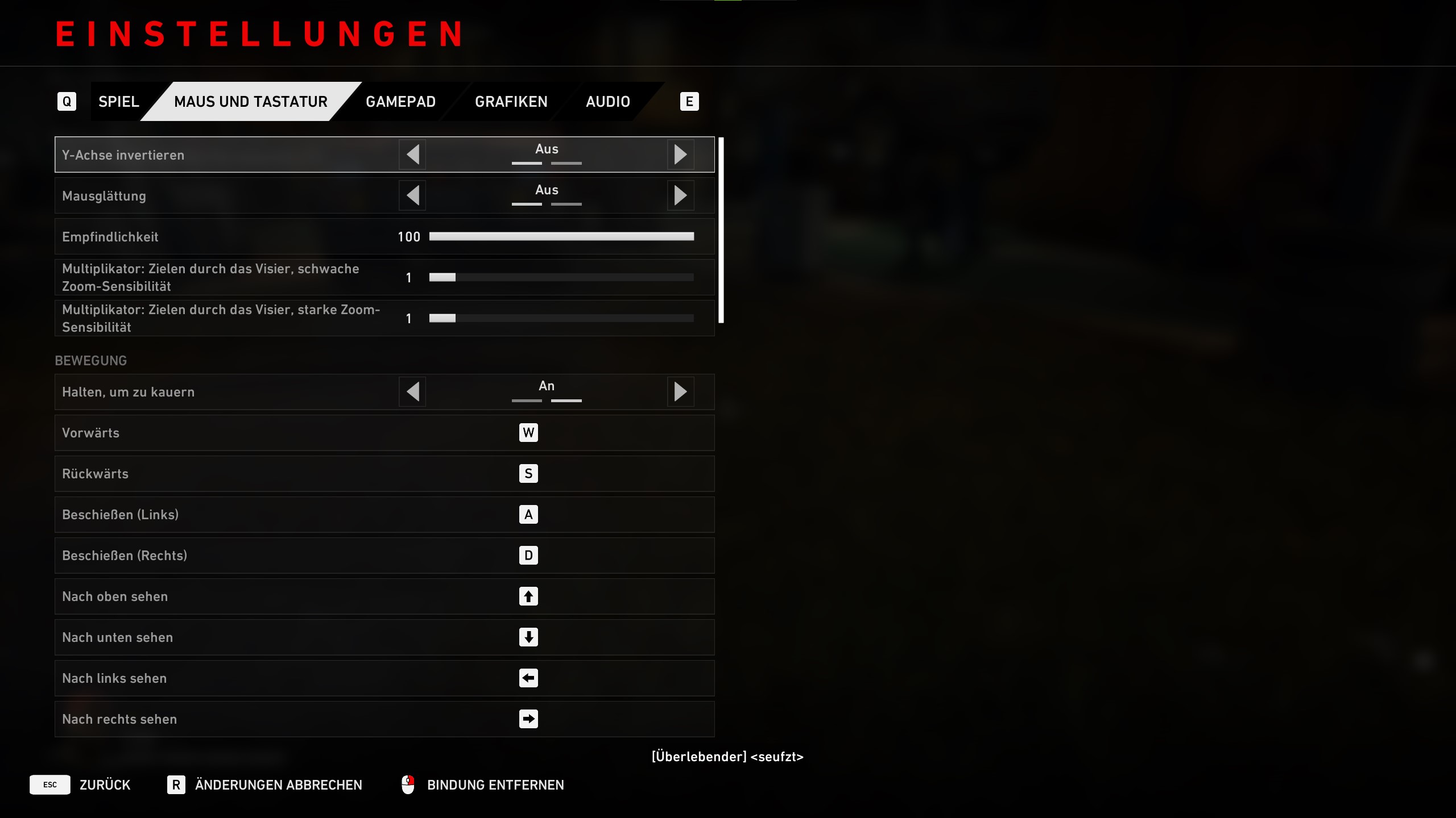Unter den Maus und Tastatur-Einstellungen könnt ihr die Y-Achse invertieren, Mausglättung an- oder ausschalten, die Empfindlichkeit, Multiplikator: Zielen durch das Visier, schwache- und starke Zoom Sensibilität anpassen und Halten, um zu kauern an- oder ausschalten.