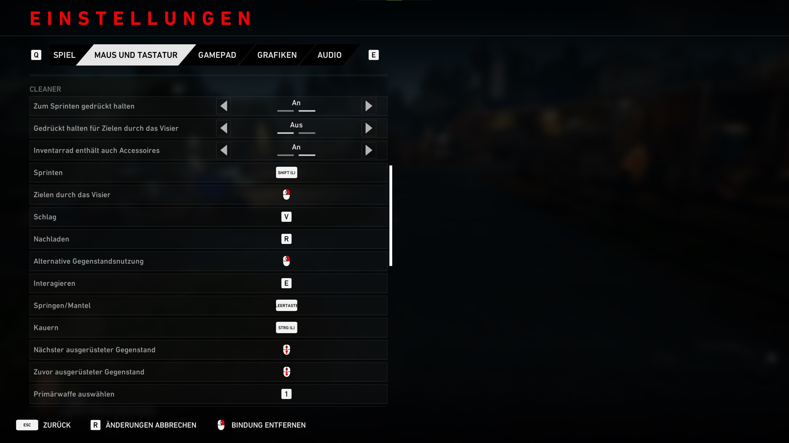 Ihr könnt für Cleaner die Tasten zum Sprinten, Zielen durch das Visier, Schlag, Nachladen, alternative Gegenstandsnutzung, Interagieren, Springen/Mantel, kauern, Nächster ausgerüsteter Gegenstand, Zuvor ausgerüsteter Gegenstand und Primärwaffe auswählen anpassen.