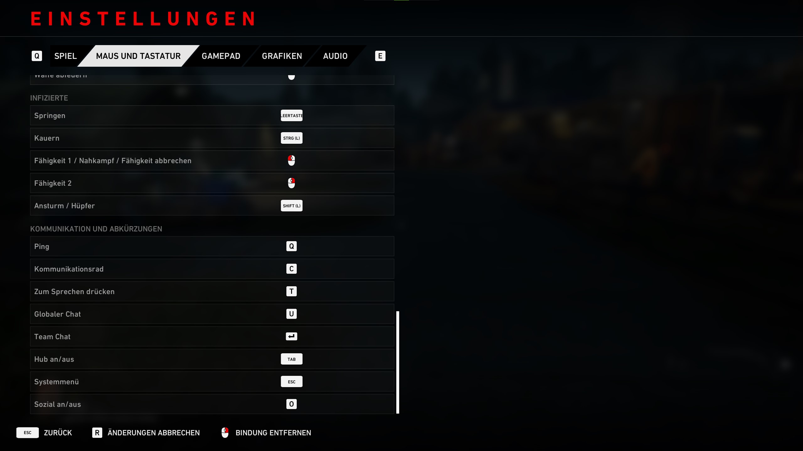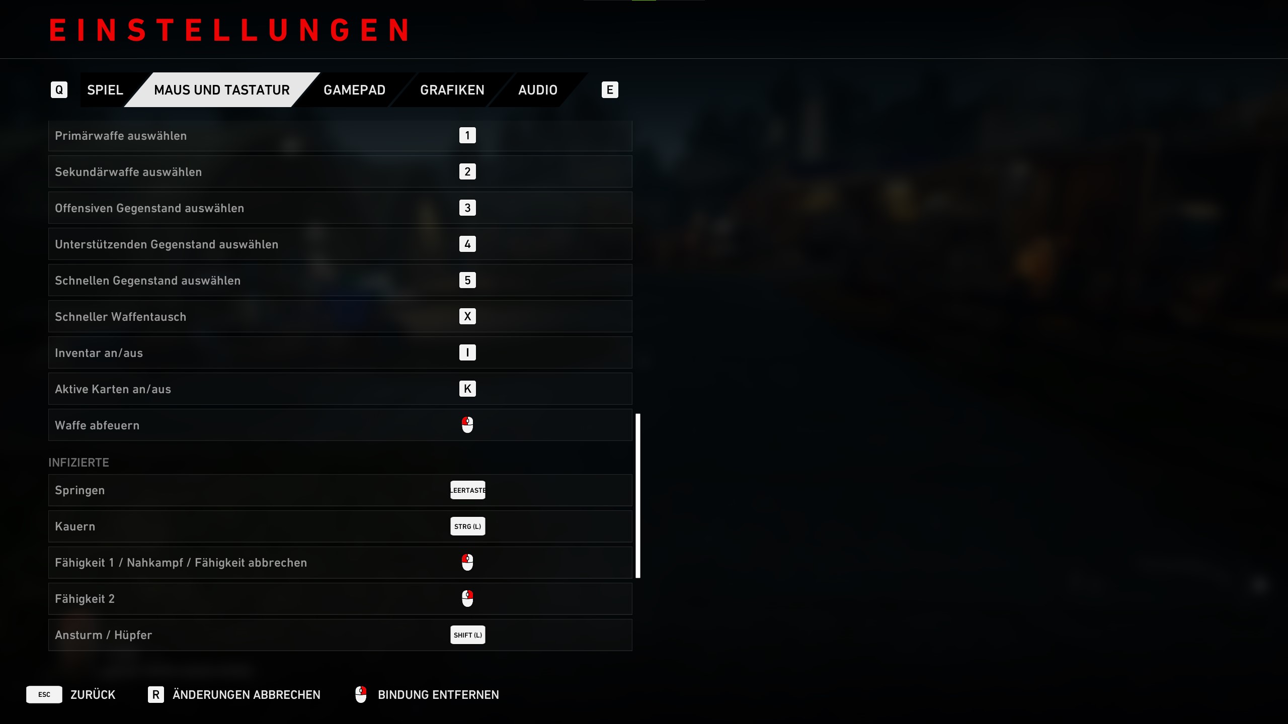 Für Infizierte könnt ihr springen, kauern, Fähigkeit 1 / Nahkampf / Fähigkeit abbrechen, Fähigkeit 2 und Ansturm / Hüpfer anpassen.