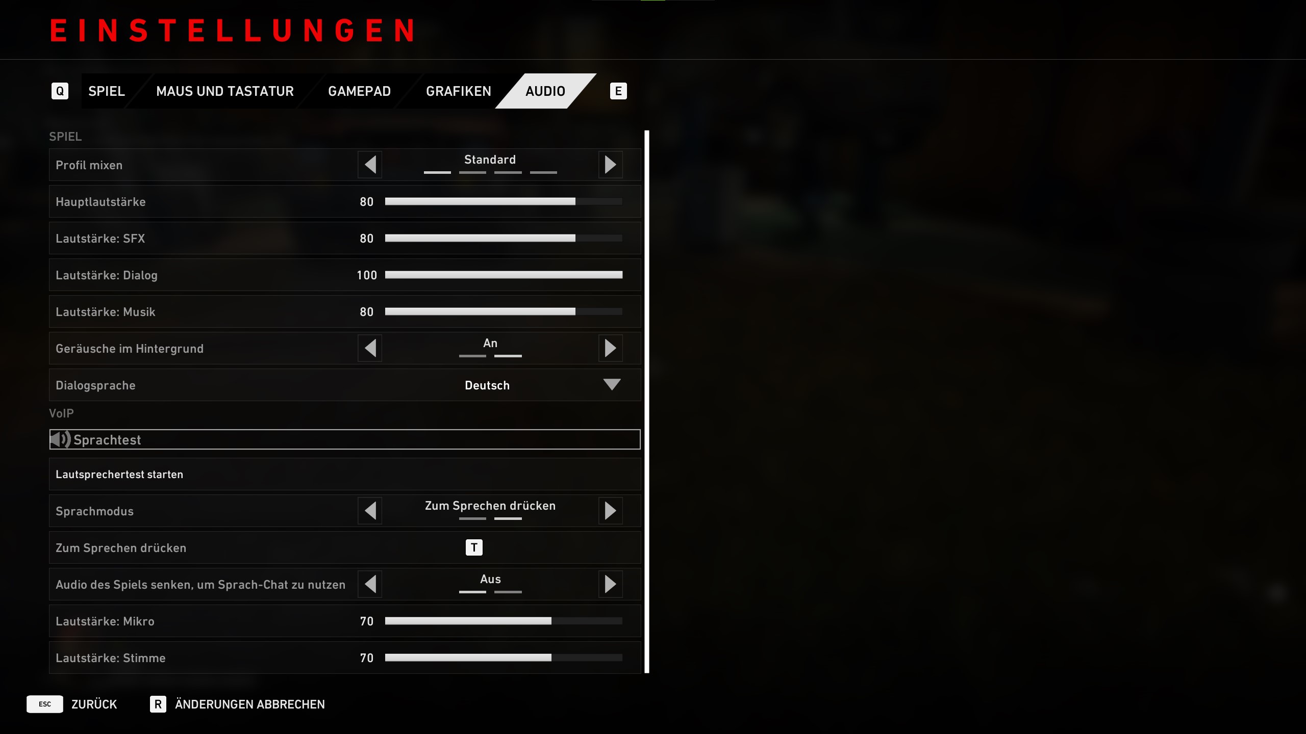Unter VoIP könnt ihr einen Sprach- und Lautsprechertest starten, den Sprachmodus und die Taste zum Sprechen anpassen, Audio des Spiels senken, um Sprach-Chat zu nutzen an- oder ausschalten, die Lautstärke von Mikrofon und Stimme anpassen.