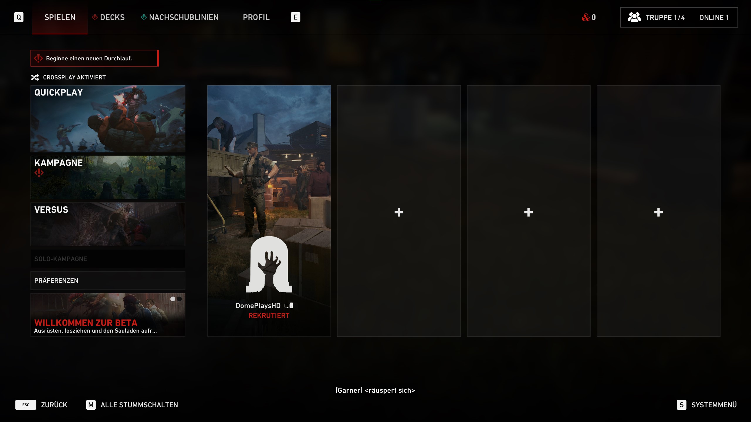 Im Hub Menü könnt ihr ein Spielmodus wählen und ein Spiel starten, auf eure Decks, Nachschublinien, euer Profil, Freunde und Truppe zugreifen. Ihr öffnet das Hub Menü mit der Tab-Taste.