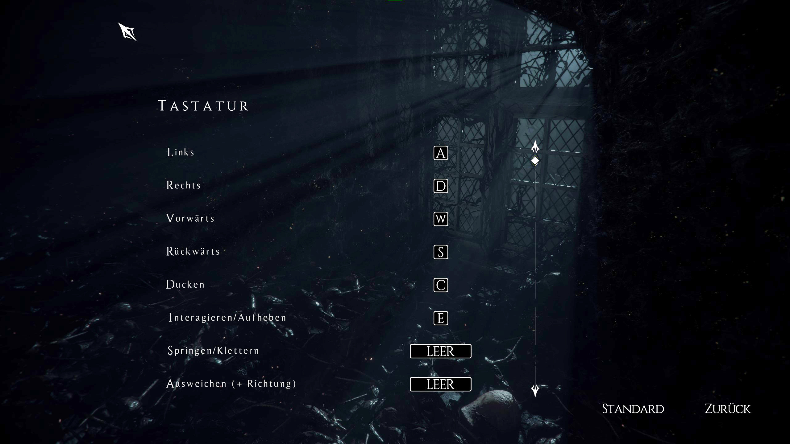 Unter der Tastaturbelegung könnt ihr die Tastaturbelegung für Links, Rechts, Vorwärts, Rückwärts, Ducken, Interagieren/Aufheben, Springen/Klettern, Ausweichen (+ Richtung) anpassen.