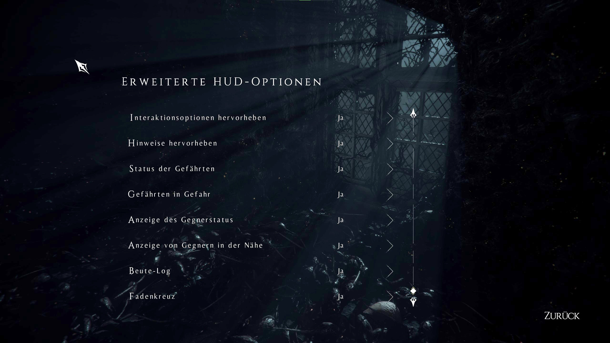 In den Erweiterten HUD-Optionen könnt ihr das Tutorial, Ziele, Munitionsstatus, Überwinden von Hindernissen, Interaktionsoptionen hervorheben, Hinweise hervorheben, Status der Gefährten und Gefährten in Gefahr an- oder ausschalten.