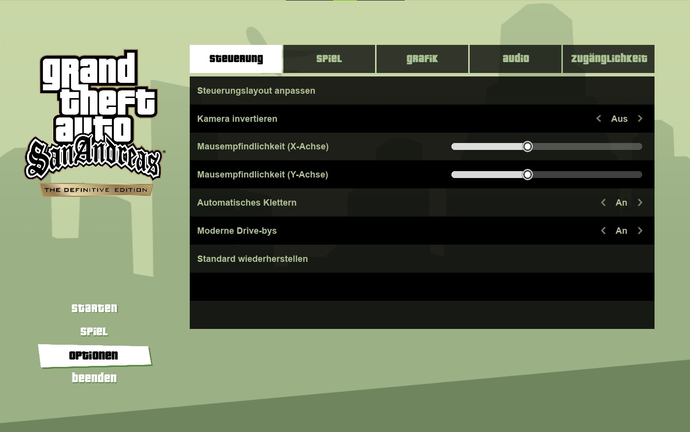 Bei den Steuerung-Einstellungen könnt ihr das Steuerungslayout (die Tastenbelegung) anpassen, die Kamera invertieren, die X- und Y-Achsen Empfindlichkeit anpassen. automatisches Klettern und moderne Drive-bys an- oder ausschalten. Außerdem könnt ihr die Standardeinstellungen wiederherstellen.