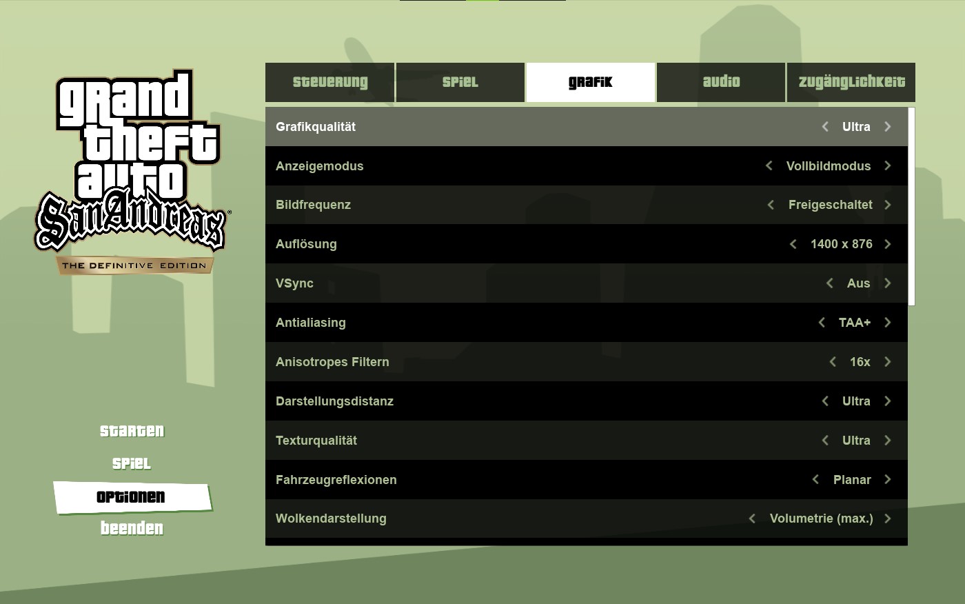 In den Grafik-Einstellungen könnt ihr die Grafikqualität den Anzeigemodus, die Bildfrequenz und Auflösung anpassen, VSync an- oder ausschalten, Antialiasing, Anisotropes Filtern, die Darstellungsdistanz, Texturqualität, Fahrzeugreflexionen, Wolkendarstellung, Reflexionsqualität, Stadtbeleuchtungseffekt, Nebel, DLSS, Umgebungsschatten-Qualität und Umgebungsverdeckung anpassen bzw. an- oder ausschalten,