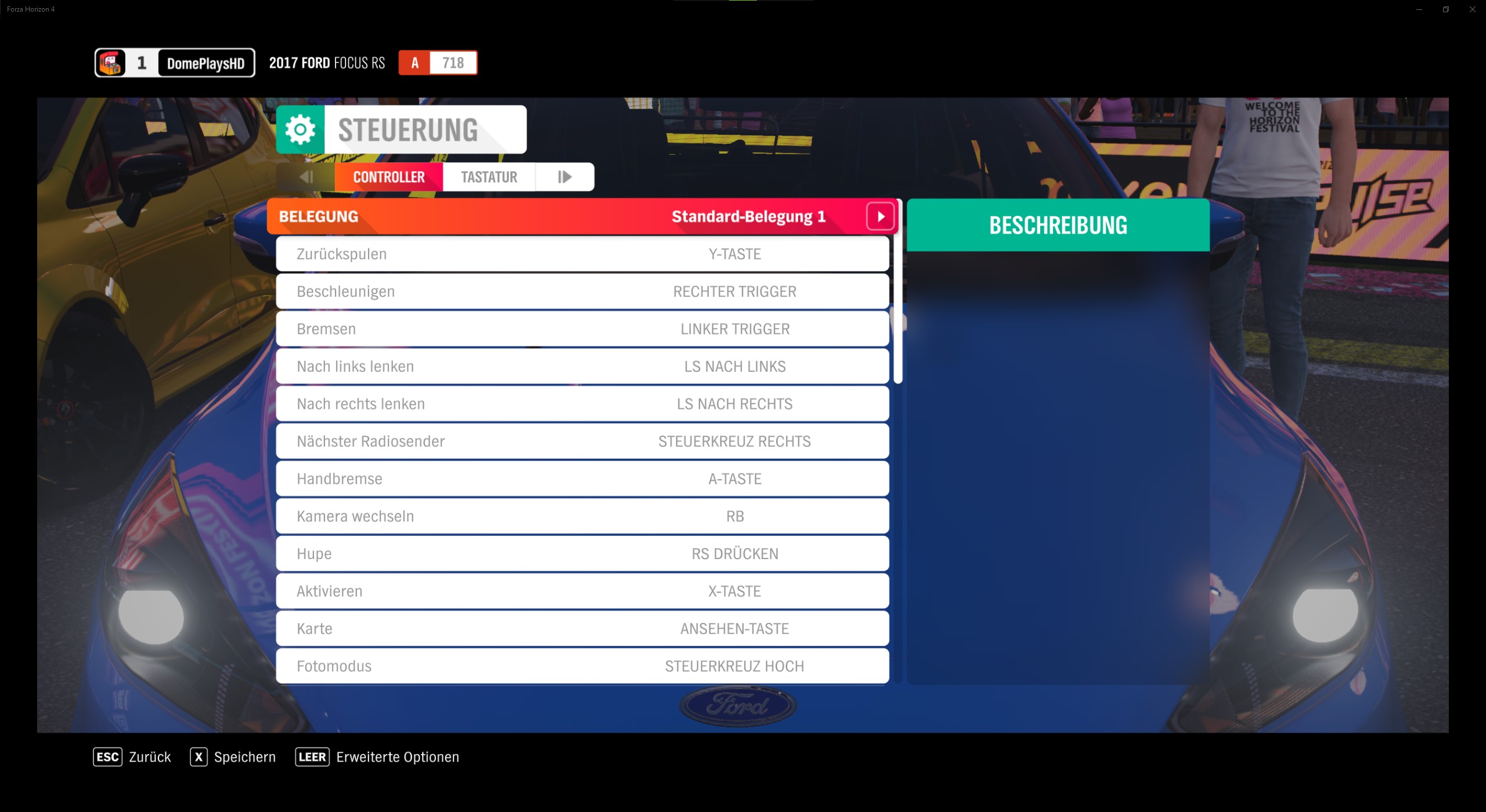 Unter den Controller-Steuerungs-Einstellungen könnt ihr Belegungs-Profile wählen, die Tastenbelegung für Zurückspulen, Beschleunigen, Bremsen/Rückwärts (halten), nach links lenken, nach rechts lenken, Kamera wechseln, Handbremse, Aktivieren, Karte, Anna aktivieren, Hupe, Fotomodus usw. anpassen.