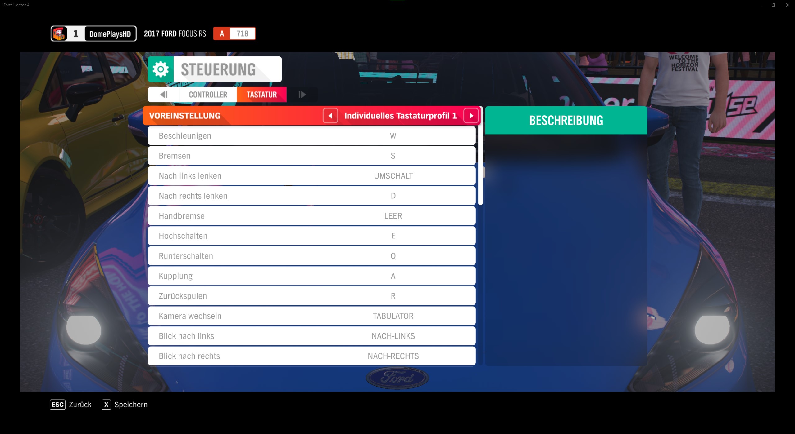 Bei den Tastatur-Steuerungs-Einstellungen könnt ihr Voreinstellungen wählen, die Tastenbelegung für Beschleunigen, Bremsen/Rückwärts (halten), nach links lenken, nach rechts lenken, Handbremse, Hochschalten, Runterschalten, Kupplung, Zurückspulen, Kamera wechseln, Cabrio-Verdeck umschalten, Bild nach links, Bild nach rechts usw. anpassen.