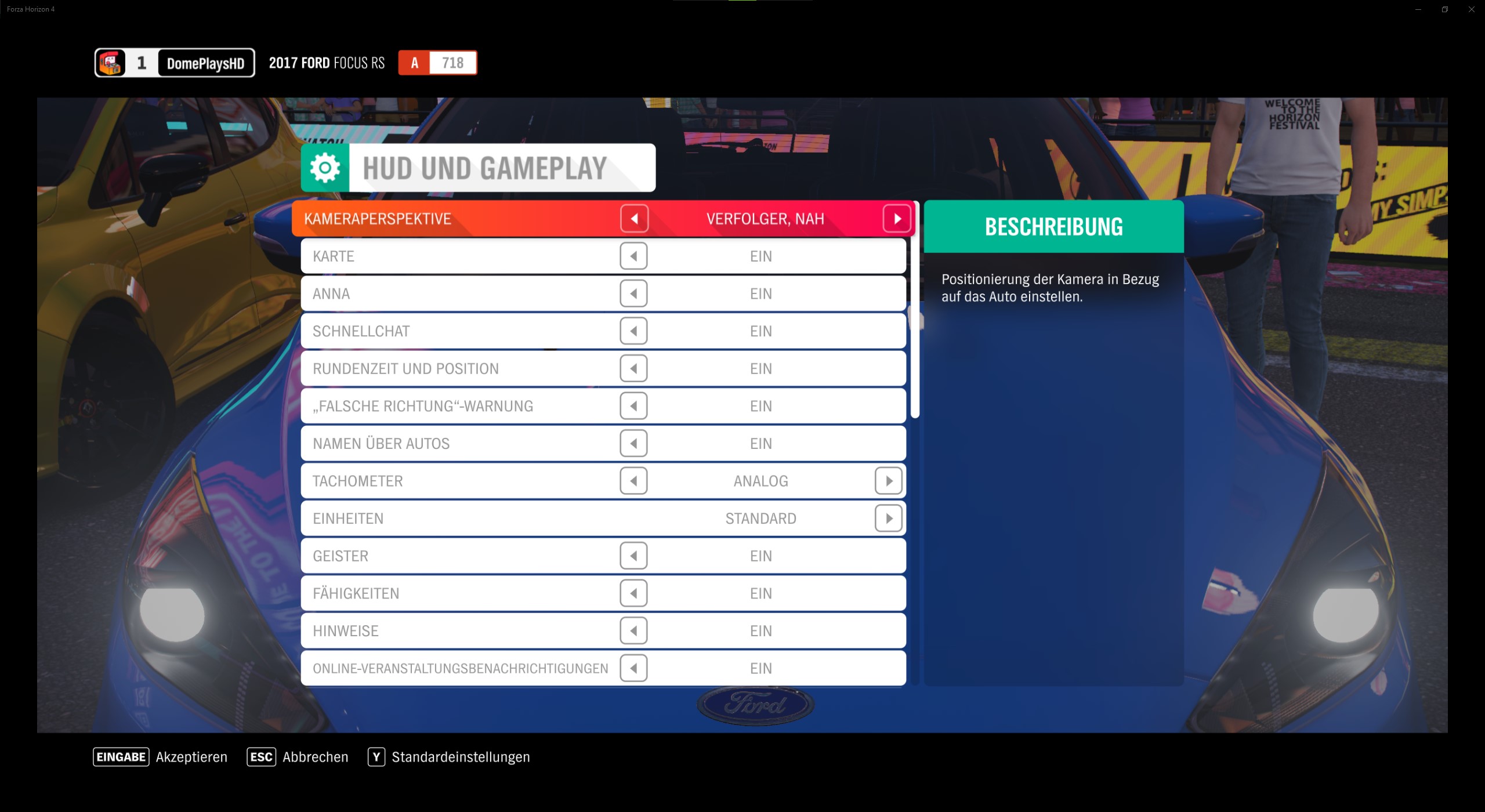 In den HUD und Gameplay-Einstellungen könnt ihr die Kameraperspektive anpassen, die Kopf-an-Kopf-Anfragen, Karte, Anna, Cabrio, Forza-Link, Rundenzeit und Position, „Falsche Richtung“-Warnung und Namen über Autos anpassen, das Tachometer, Einheiten, Triebwerke und Federn anpassen,