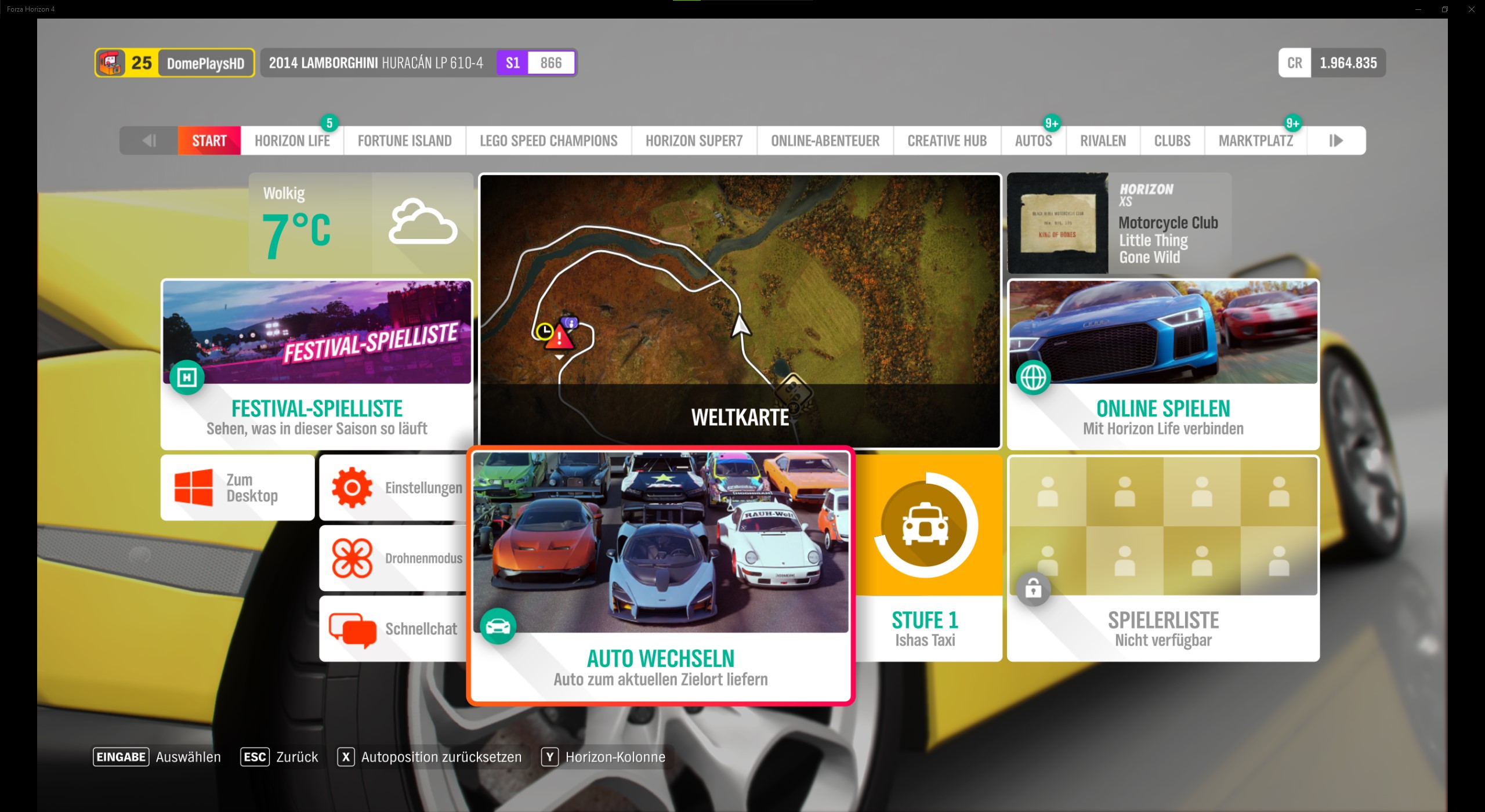 Außerdem könnt ihr auf die Kampagne, Autos, mein Horizon, Online, Creative Hub und den Shop zugreifen.