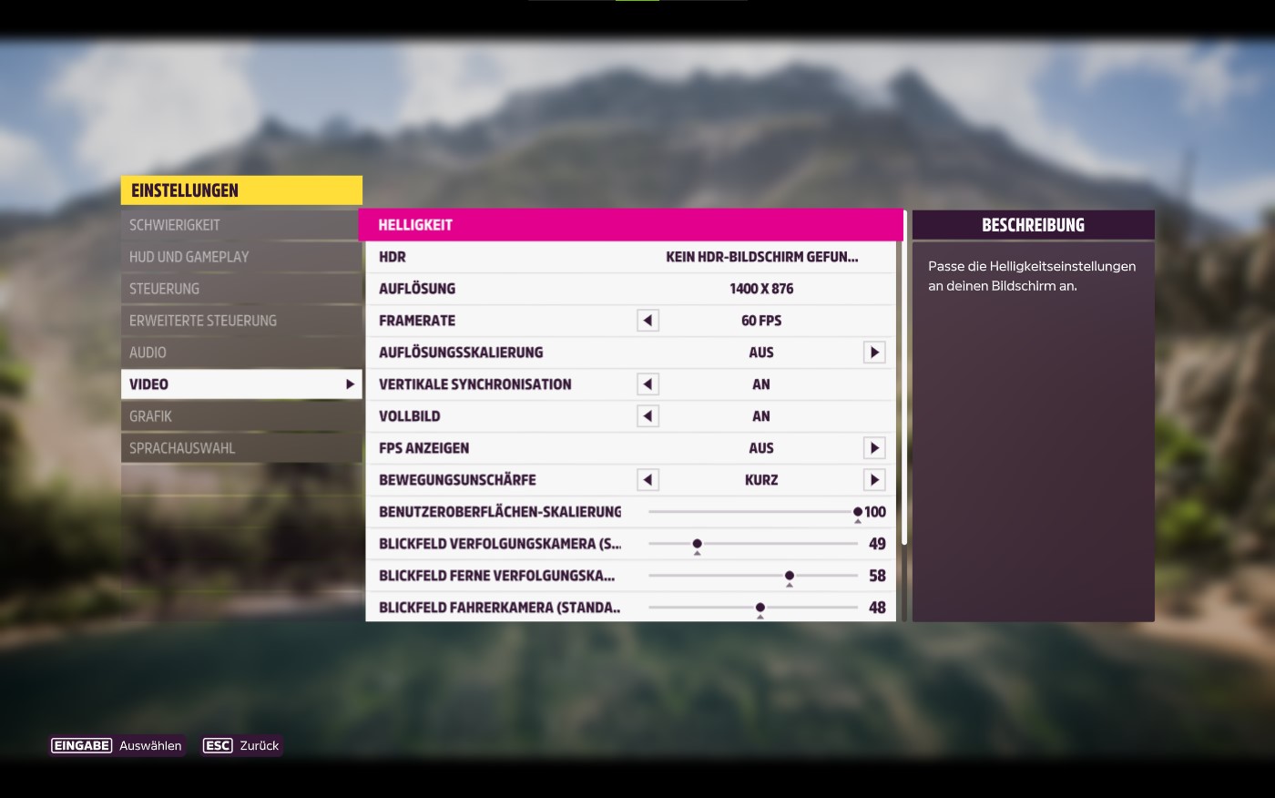 Unter den Video-Einstellungen könnt ihr die Helligkeit anpassen, HDR an oder ausschalten, die Auflösung und Framerate anpassen, die Auflösungsskalierung, vertikale Synchronisation, Vollbild und FPS anzeigen an- oder ausschalten, die Bewegungsunschärfe, Benutzeroberflächen-Skalierung, Blickfeld Verfolgungskamera und Fahrerkamera, die Blickfeld Motorhauben-Kamera und Stoßstangenkamera anpassen.