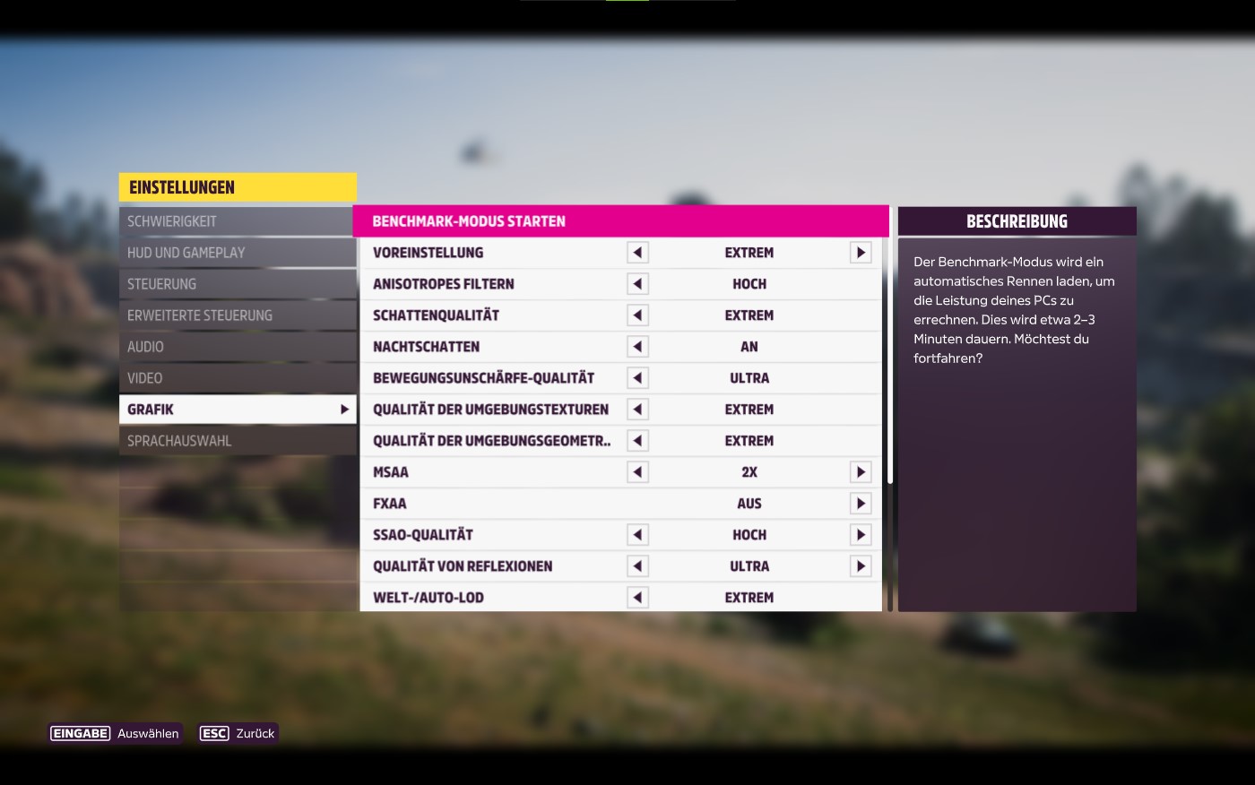 Unter den Grafik-Einstellungen könnt ihr den Benchmark-Modus starten, Voreinstellungen wählen, Anisotropes Filtern und Schattenqualität anpassen, den Nachtschatten an- oder ausschalten, die Bewegungsunschärfe-Qualität, Qualität der Umgebungs- Texturen und Geometrie und MSAA anpassen, FXAA an- oder ausschalten, SSAO- Qualität, Qualität von Reflexionen und Welt-/Auto-LOD anpassen.
