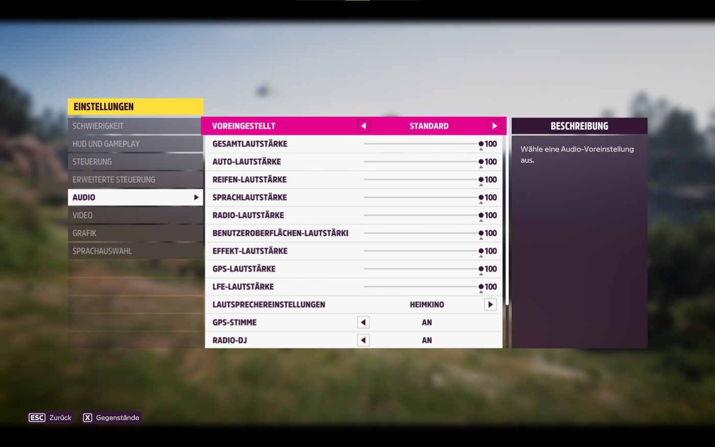 In den Audio-Einstellungen könnt ihr Voreinstellungen wählen, die Gesamtlautstärke, die Lautstärke von Auto, Reifen, Sprache, Radio, Benutzeroberfläche, Effekte, GPS und LFE anpassen.