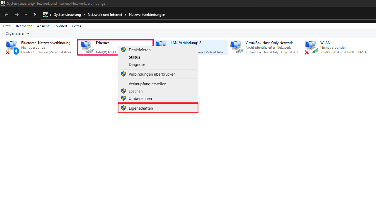 Anschließend öffnet sich das Netzwerkverbindungen Fenster, dort angekommen macht man einen Rechtsklick auf den Ethernet Adapter und klickt auf "Eigenschaften".