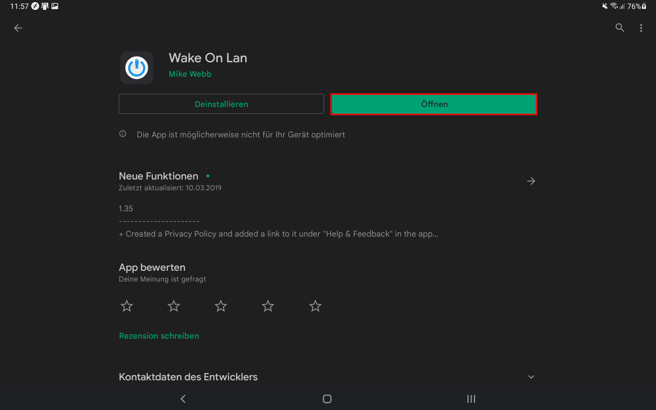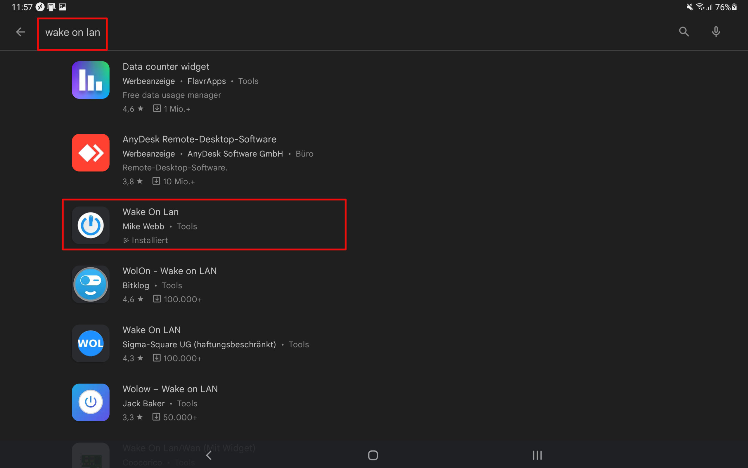 Zuerst geht man in den Google Play Store, sucht nach "wake on lan" und installiert die Wake On Lan App von Mike Webb.