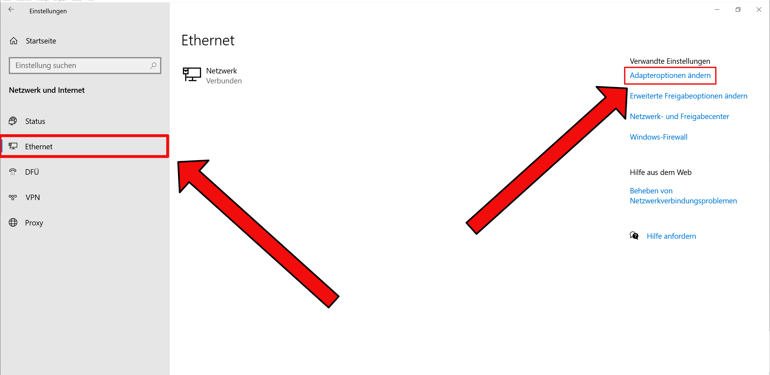 Nach der Installation des Netzwerk Treibers geht man in den Windows Einstellungen auf „Netzwerk und Internet“, dann auf „Ethernet“ und anschließend, oben rechts bei Verwandte Einstellungen auf „Adapteroptionen ändern“.