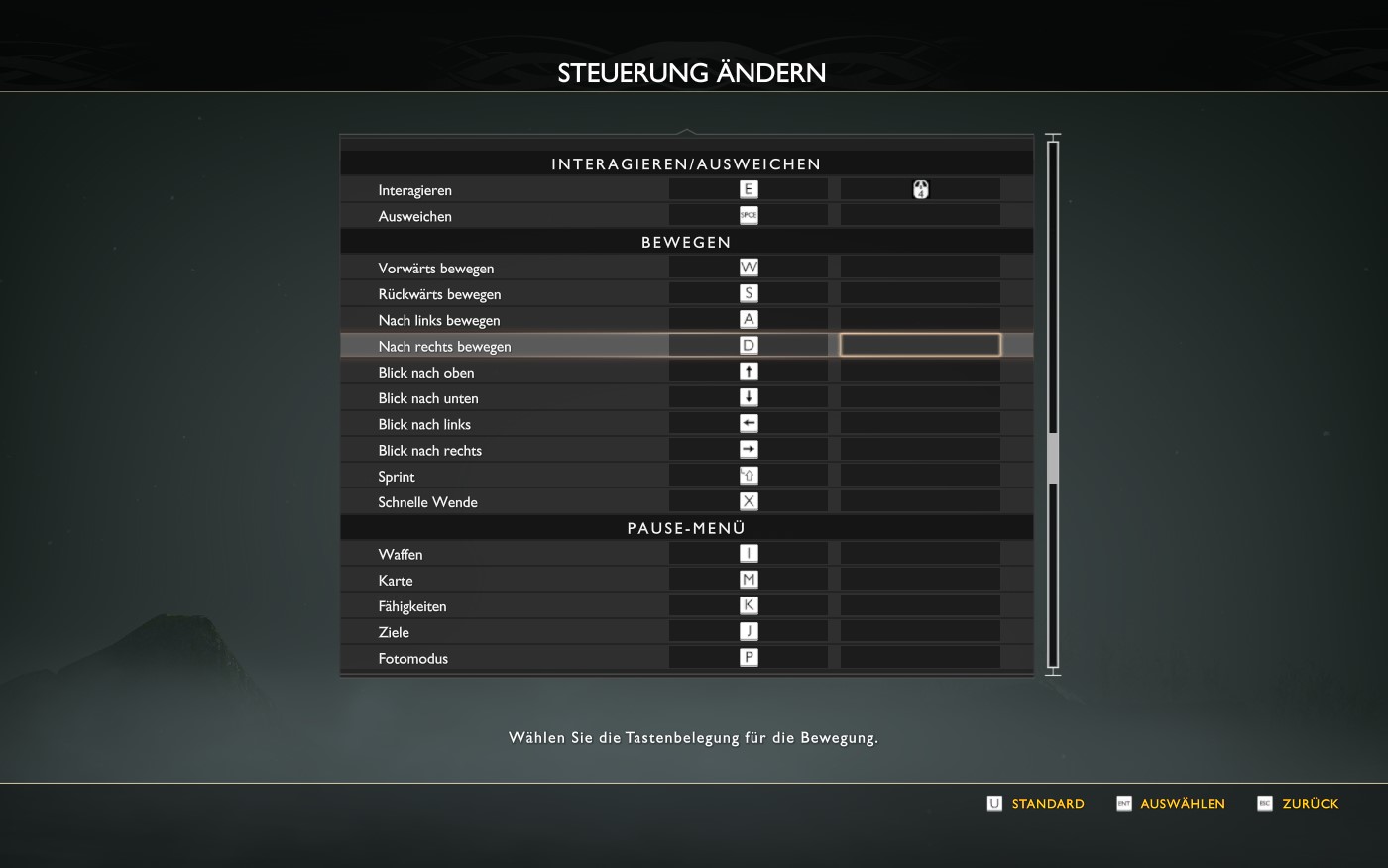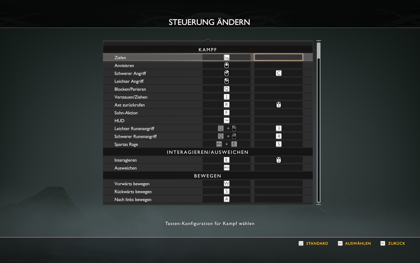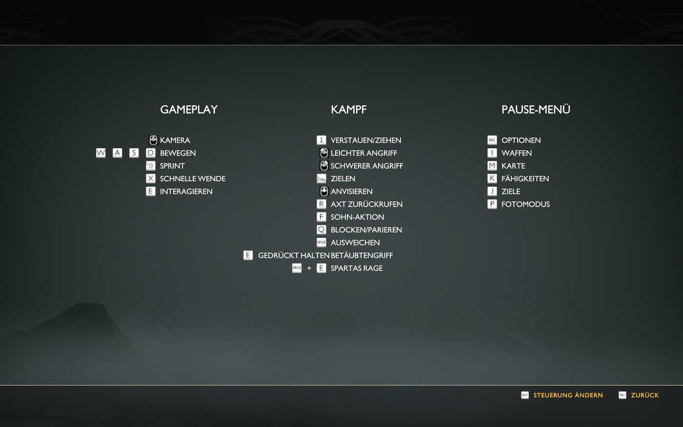 Ihr könnt unter Steuerung ändern die Tastenbelegung anpassen für Zielen, Anvisieren, schwerer- und leichter Angriff, Blocken/Parieren, Verstauen/Ziehen, Axt zurückrufen, Sohn-Aktion, HUD, leichter- und schwerer Runenangriff, Spartas Rage, Interagieren, Ausweichen, Bewegen, Sprint (Rennen), schnelle Wende.