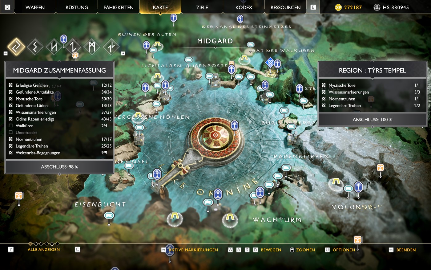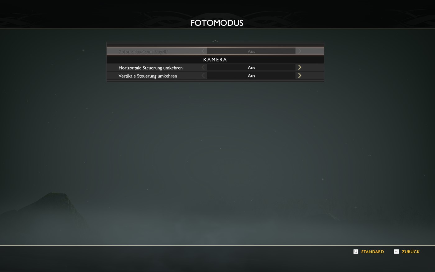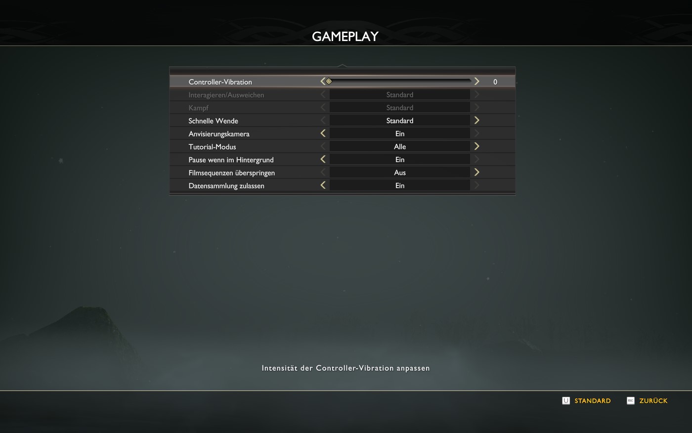 Ihr könnt unter Steuerung ändern die Tastenbelegung anpassen für Zielen, Anvisieren, schwerer- und leichter Angriff, Blocken/Parieren, Verstauen/Ziehen, Axt zurückrufen, Sohn-Aktion, HUD, leichter- und schwerer Runenangriff, Spartas Rage, Interagieren, Ausweichen, Bewegen, Sprint (Rennen), schnelle Wende.