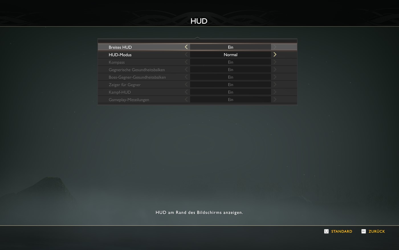 Bei den HUD-Einstellungen könnt ihr das breite HUD, den HUD-Modus, Kompass, Gegnerische Gesundheitsbalken, Boss-Gegner Gesundheitsbalken, Zeiger für Gegner, das Kampf-HUD und die Gameplay-Mitteilungen an- oder ausschalten bzw. anpassen.