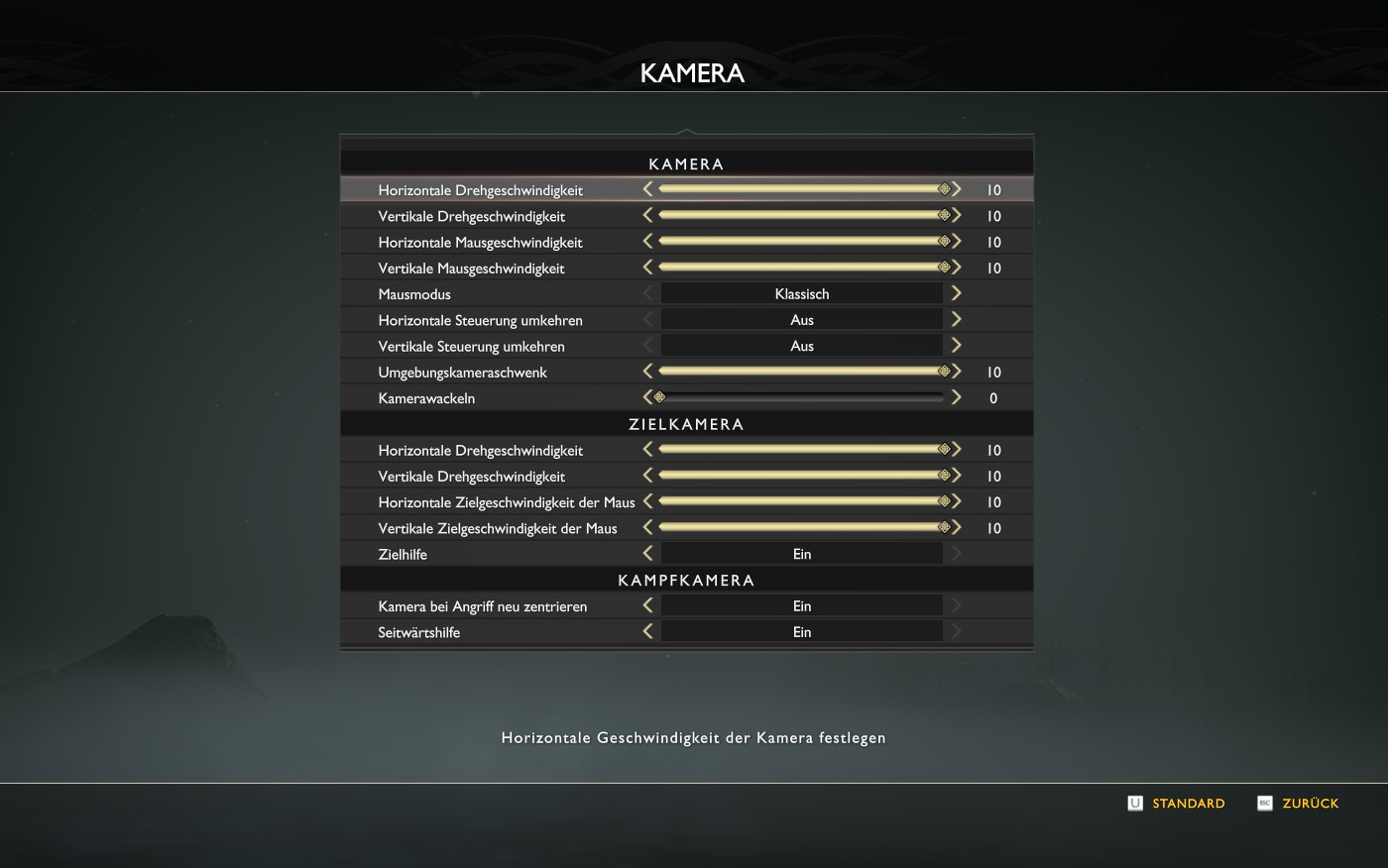 Ihr könnt unter den Kamera-Einstellungen die horizontale- und vertikale Drehgeschwindigkeit, die horizontale- und vertikale Mausgeschwindigkeit, den Mausmodus, die horizontale- und vertikale Steuerung umkehren, den Umgebungskameraschwenk und das Kamerawackeln an- oder ausschalten bzw. anpassen.