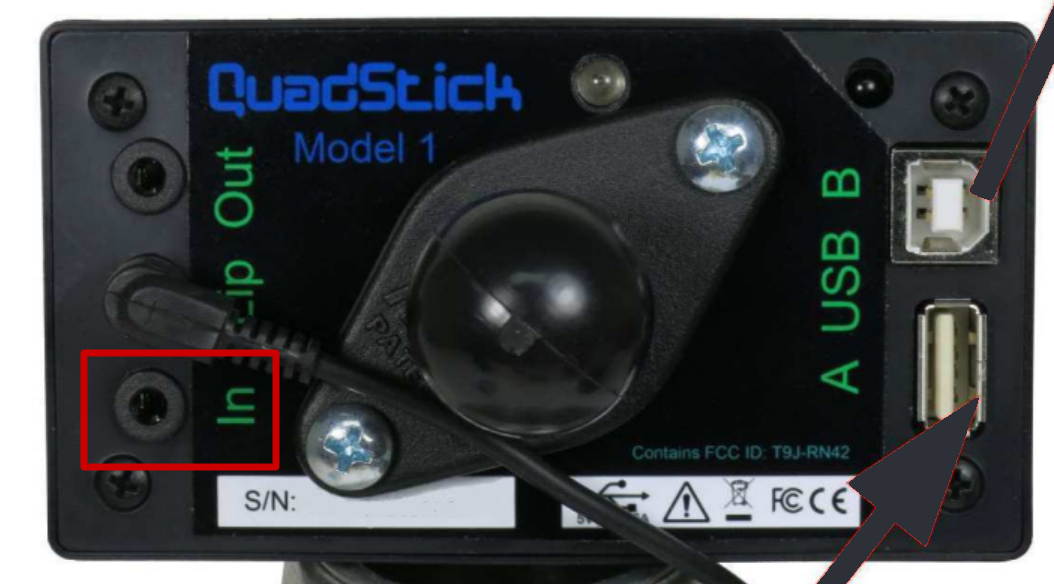 Um einen externen Schalter an den Quadstick anzuschließen, muss dieser hinten am Quadstick in den 3,5 mm "In" Eingang gesteckt werden. Außerdem lässt sich mit einem 3,5 mm TRS auf Dual 3,5 mm TSF Adapter Kabel ein weiterer Schalter anschließen.