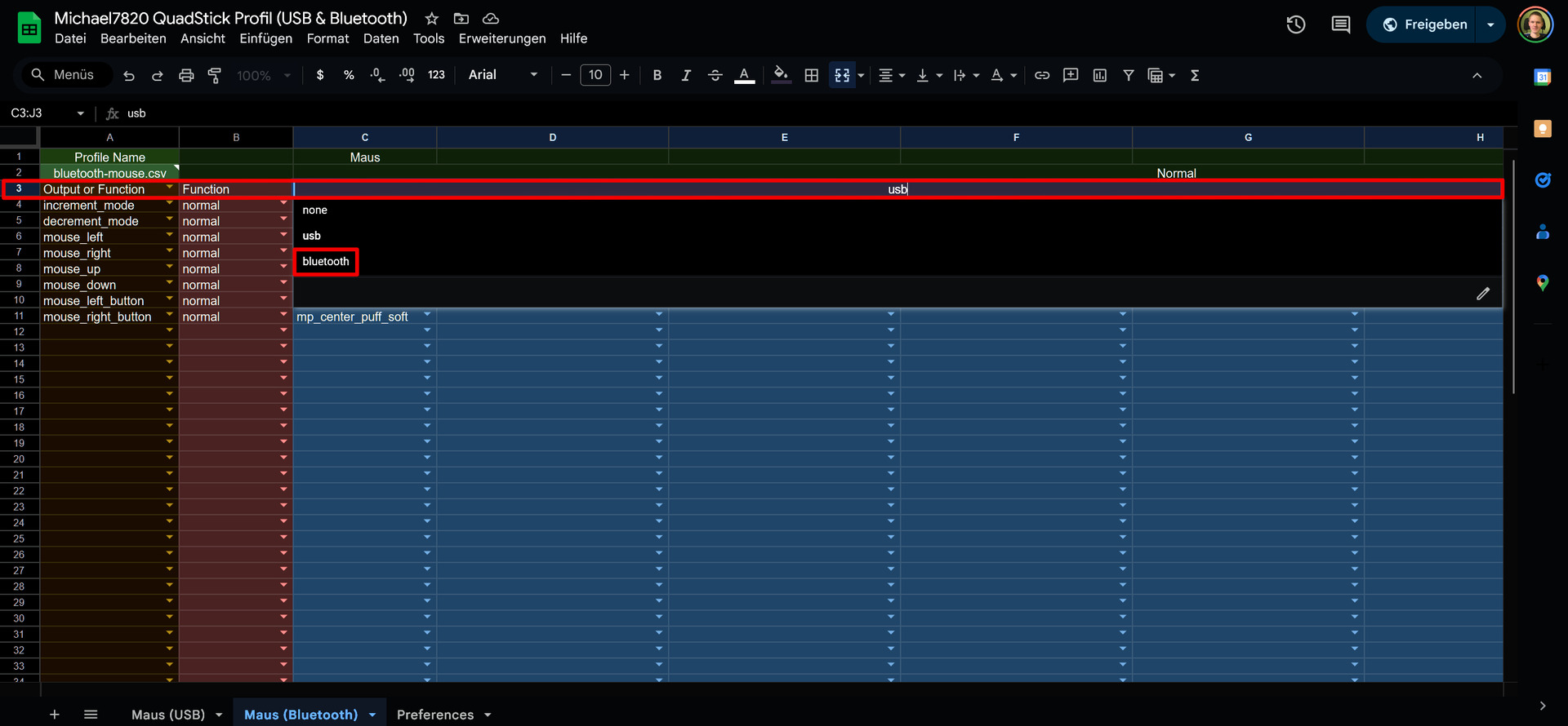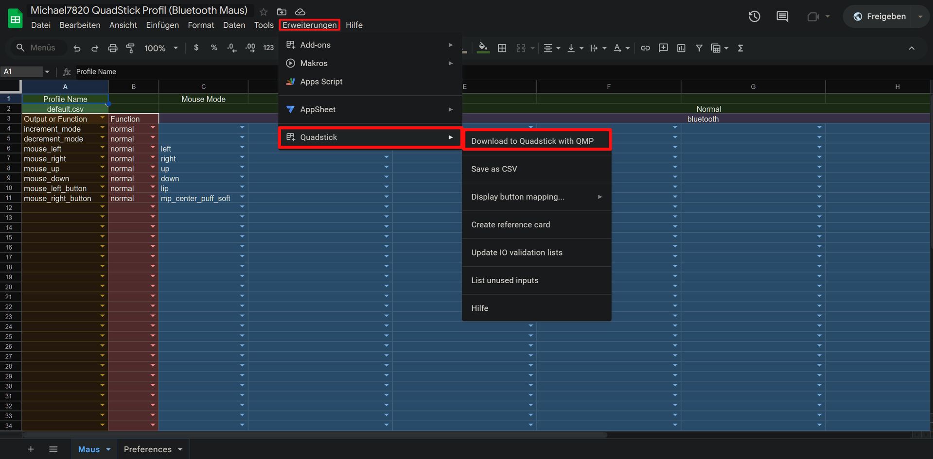 Zum Schluss muss nur ein Maus Profil erstellt oder ein vorhandenes genommen werden. Ihr könnt auch einfach unseres nehmen, welches wir extra für dieses Tutorial erstellt haben. Hier der Link: https://docs.google.com/spreadsheets/d…tzceURJM2ov8NNM