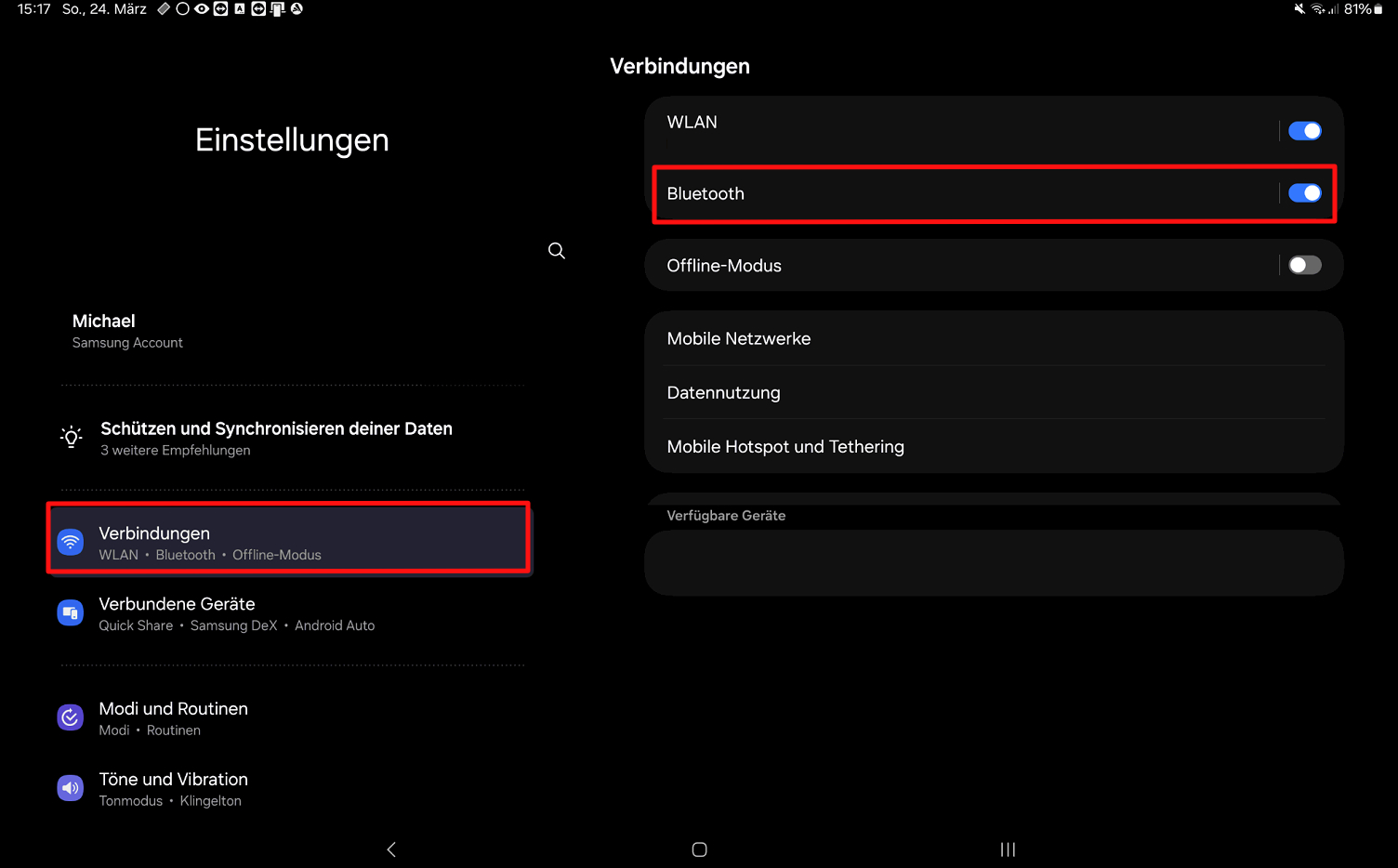 Jetzt kann man auch schon eine Bluetooth-Verbindung mit dem Quadstick herstellen. Bei Android geht man dazu in die Einstellungen und bei "Verbindungen" auf "Bluetooth".