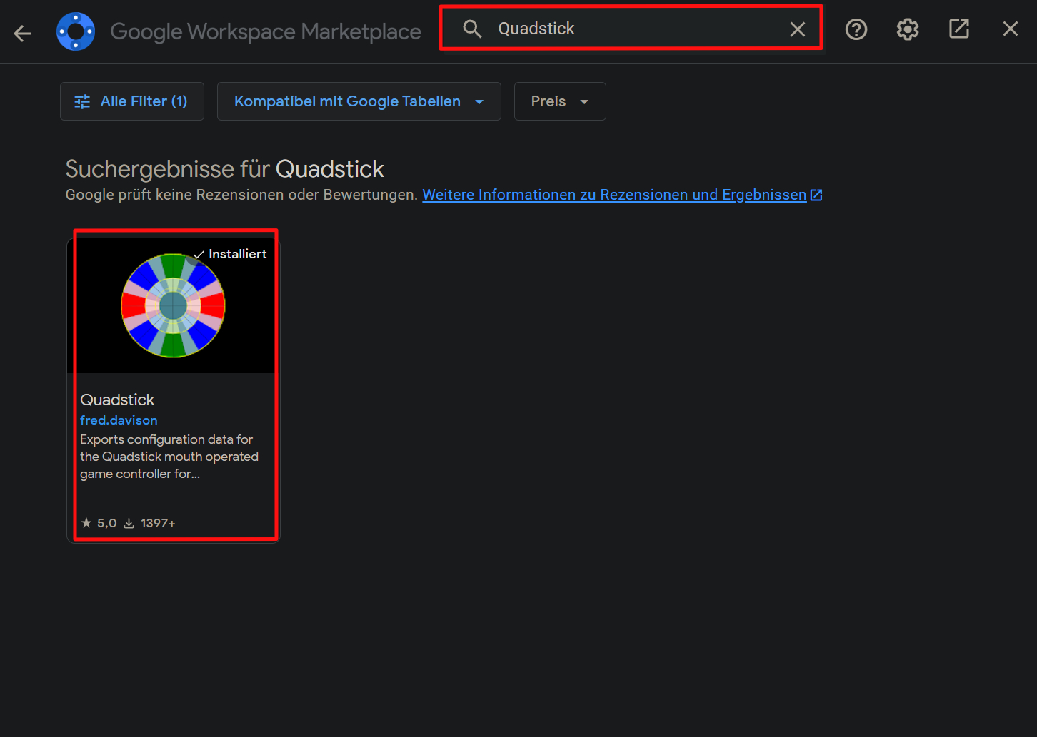 Anschließend gibt ihr "Quadstick" im Suchfeld ein und klickt das Add-On an.