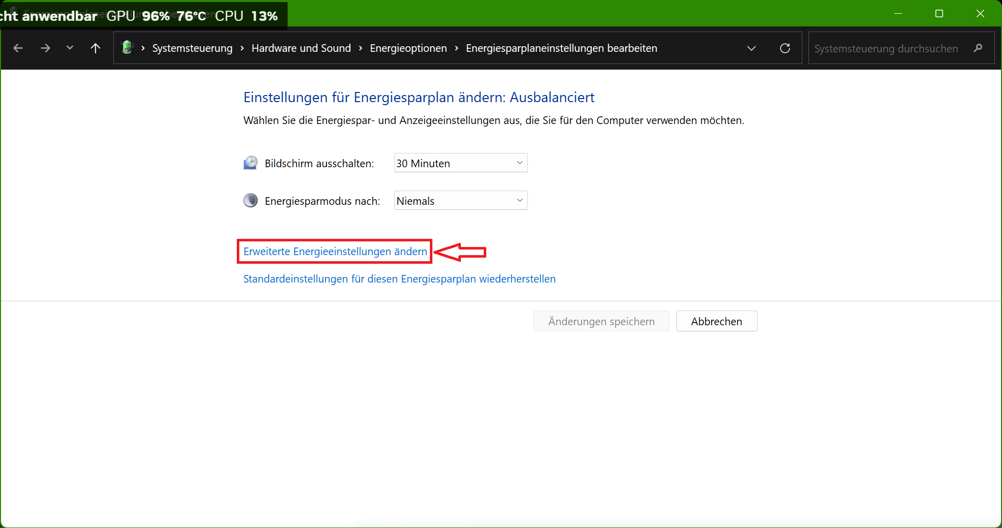 Klickt auf „Erweiterte Energieeinstellungen ändern“.