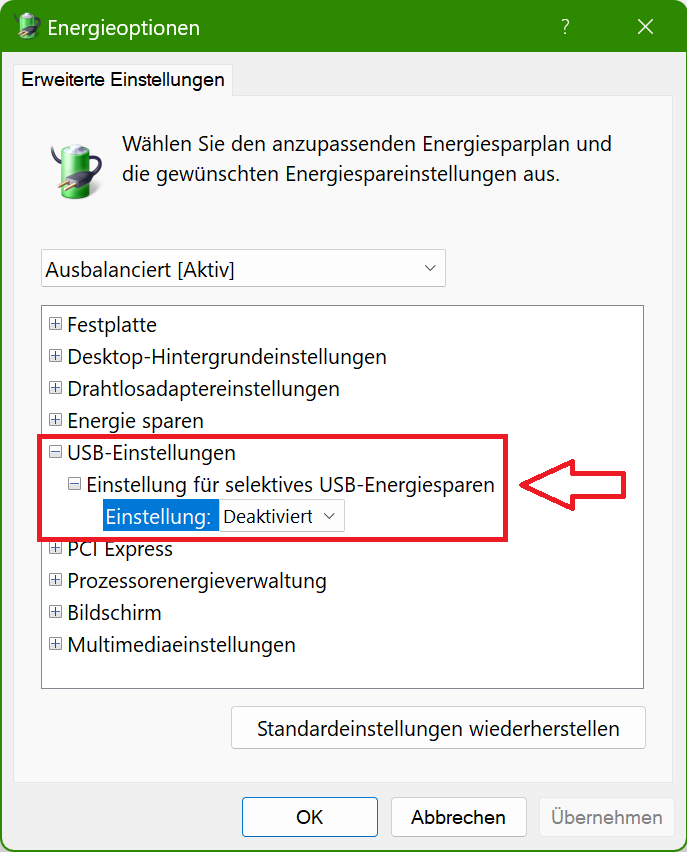 Windows USB-Energiesparen deaktivieren