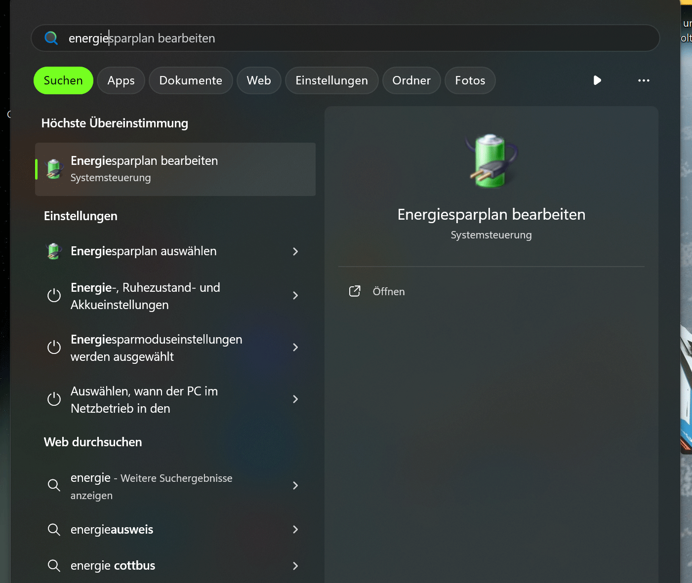 Öffnet das Startmenü und gebt „energie“ ein. Klickt anschließend auf Energiesparplan bearbeiten.