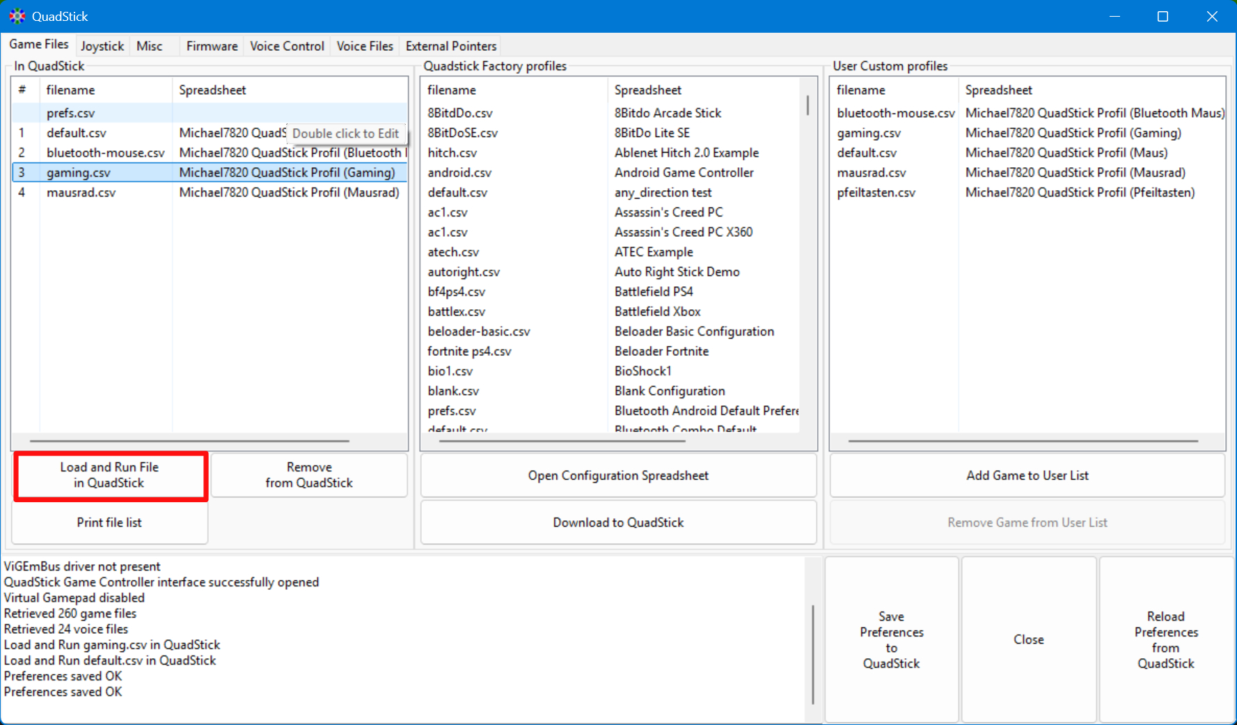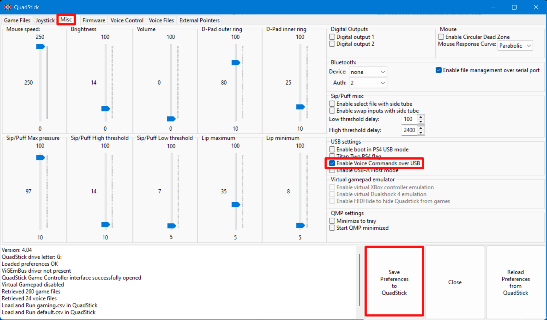 Damit der "Load and Run File in Quadstick" Button im Quadstick Manager Programm nicht mehr ausgegraut ist, muss man zum Misc Tab wechseln und einen Haken bei "Enable Voice Commands over USB" setzen. und auf "Save Preferences to Quadstick" drücken. Anschließend sollte der Button funktionieren.