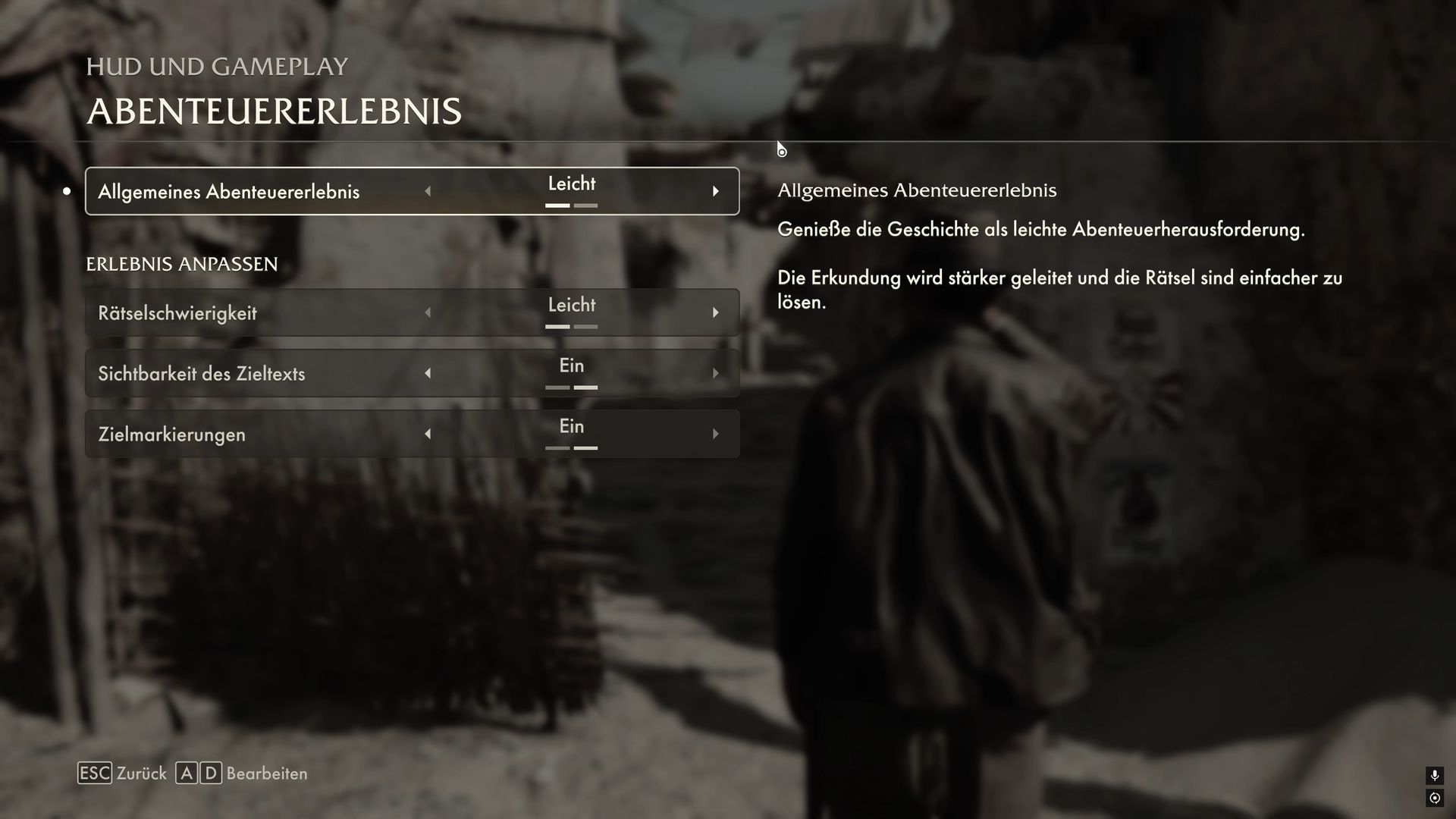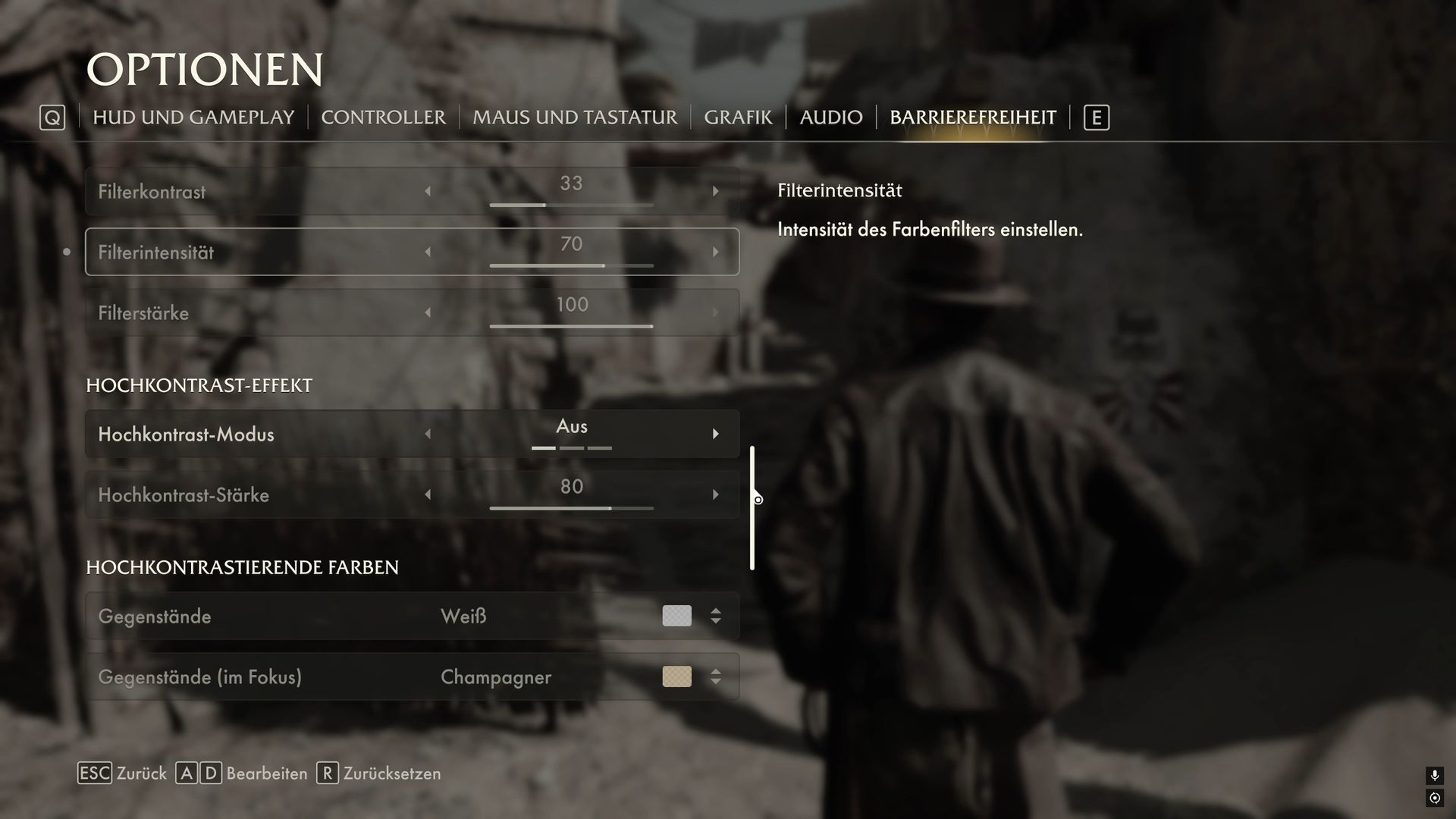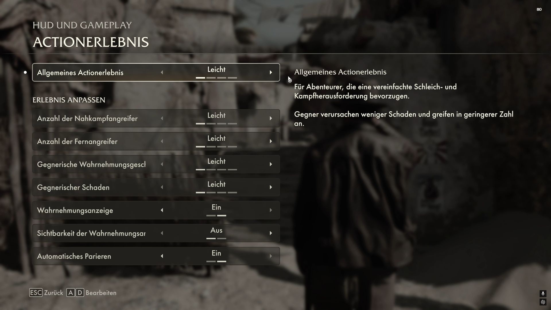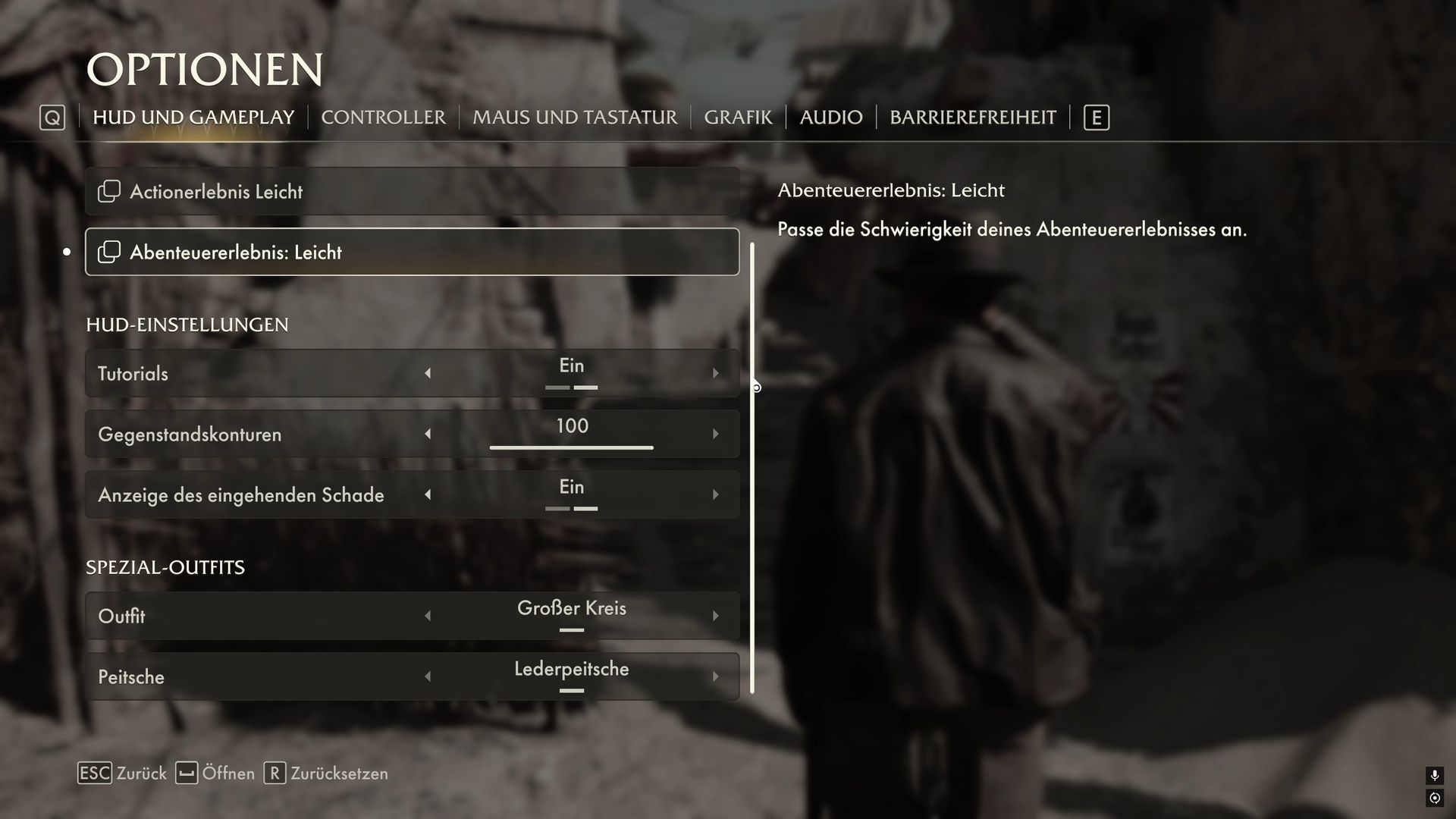 Unter HUD und Gameplay können die Tutorials und die Anzeige des eingehenden Schadens an oder ausgeschaltet werden. Außerdem können die Gegenstandskonturen, das Outfit und das Aussehen von der Peitsche angepasst werden.