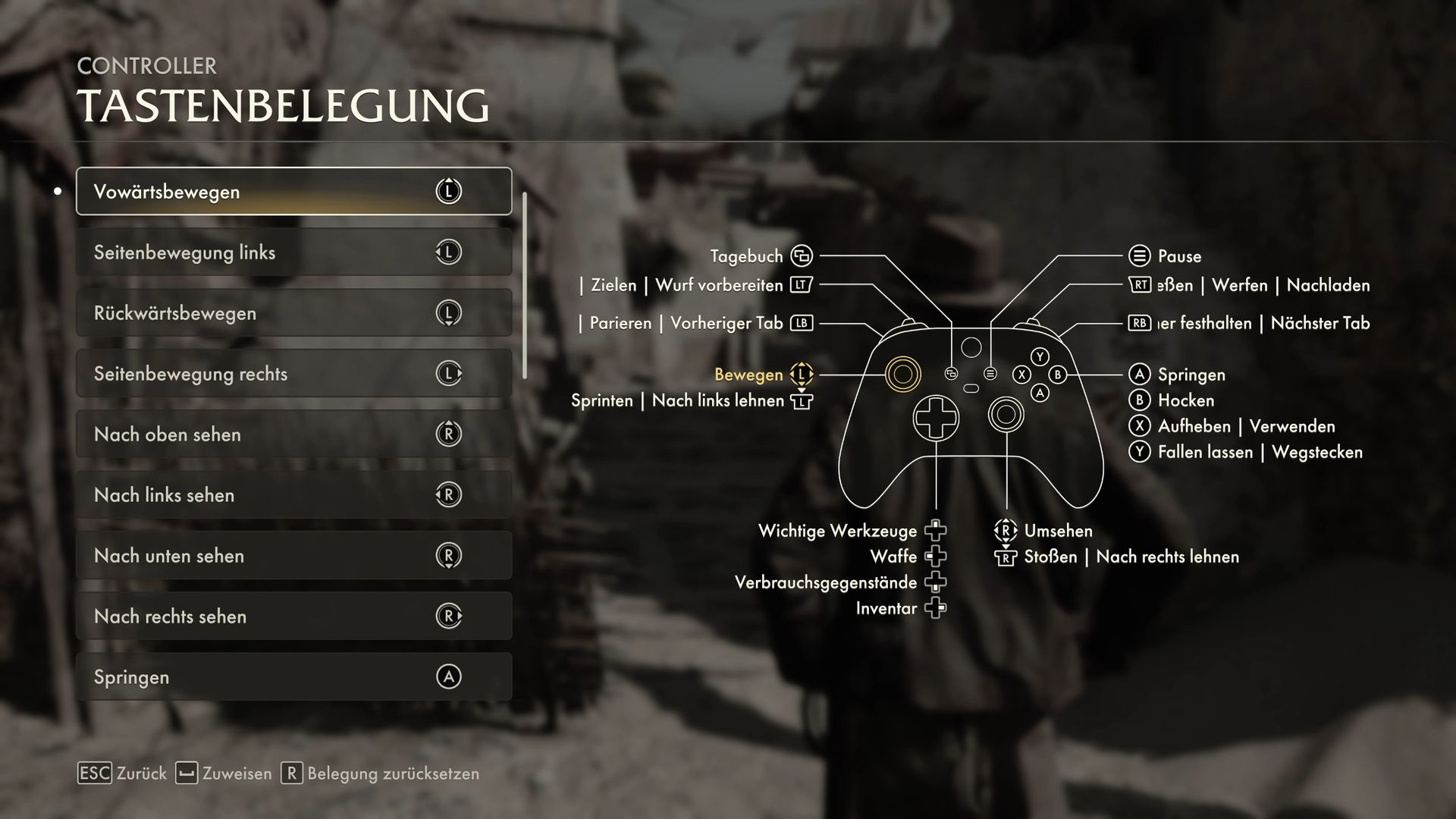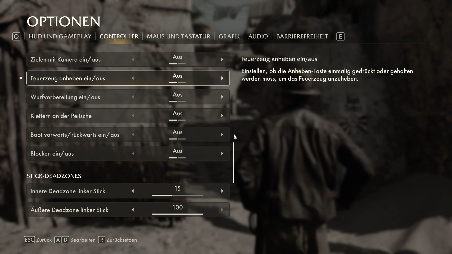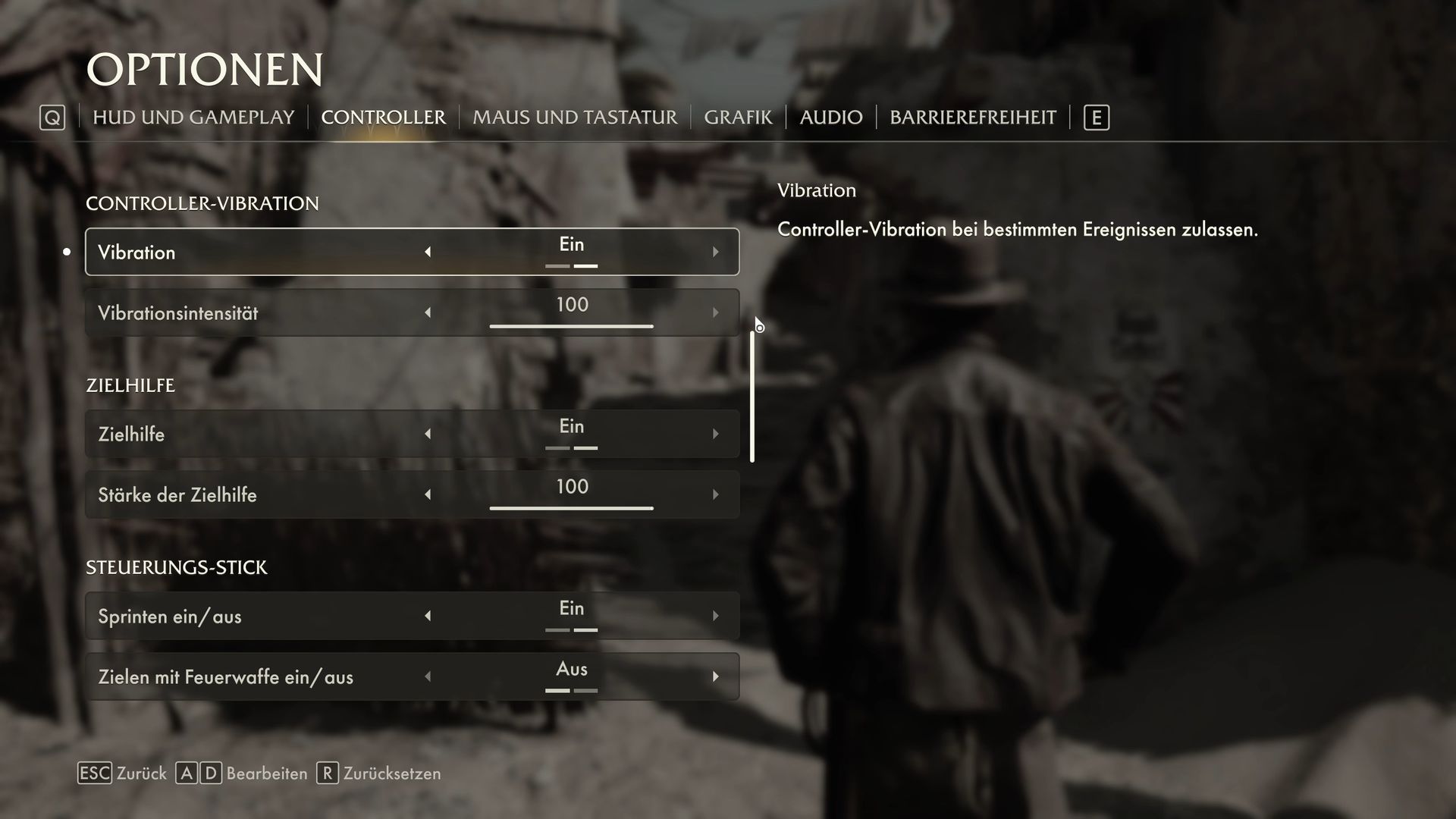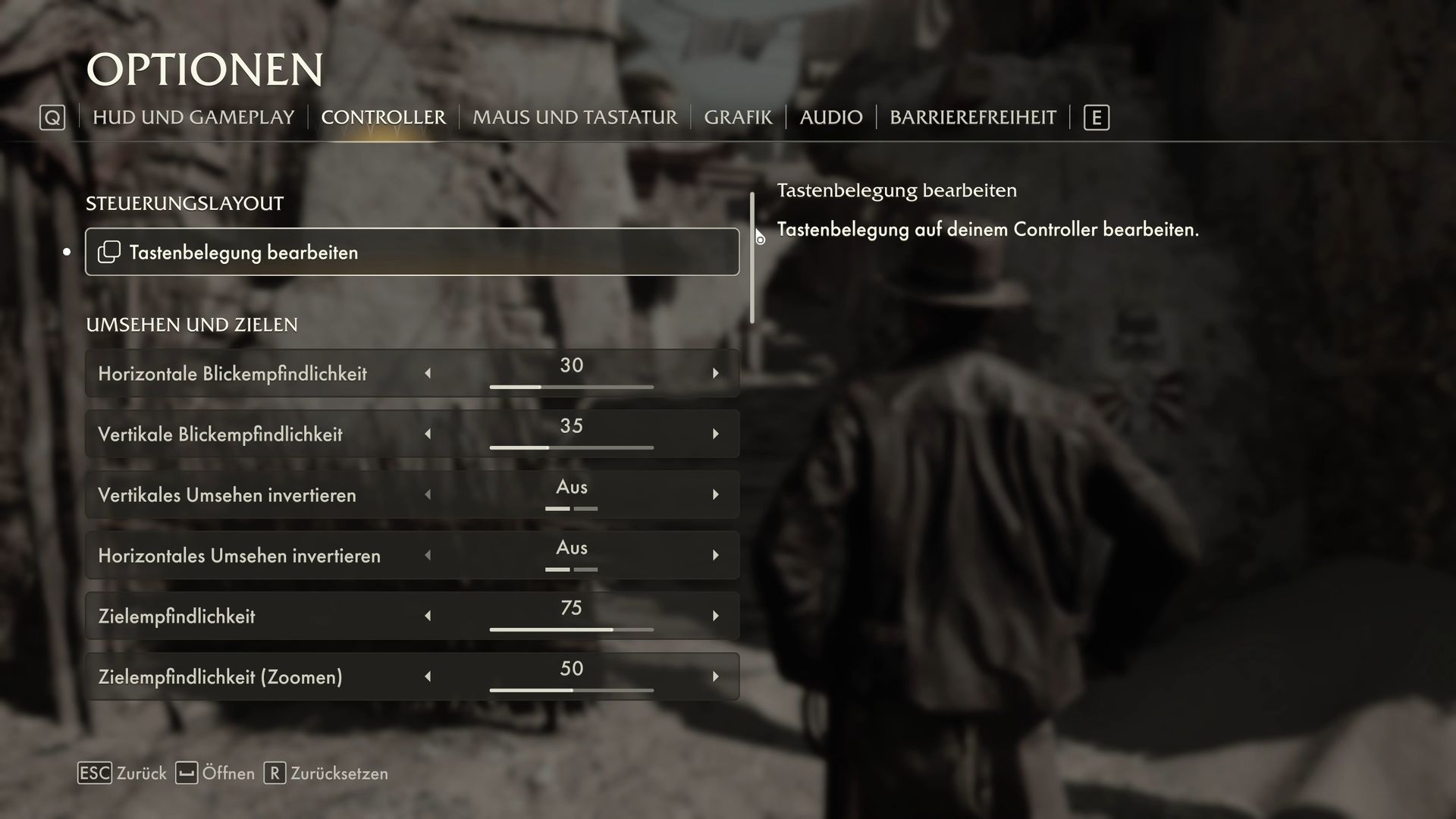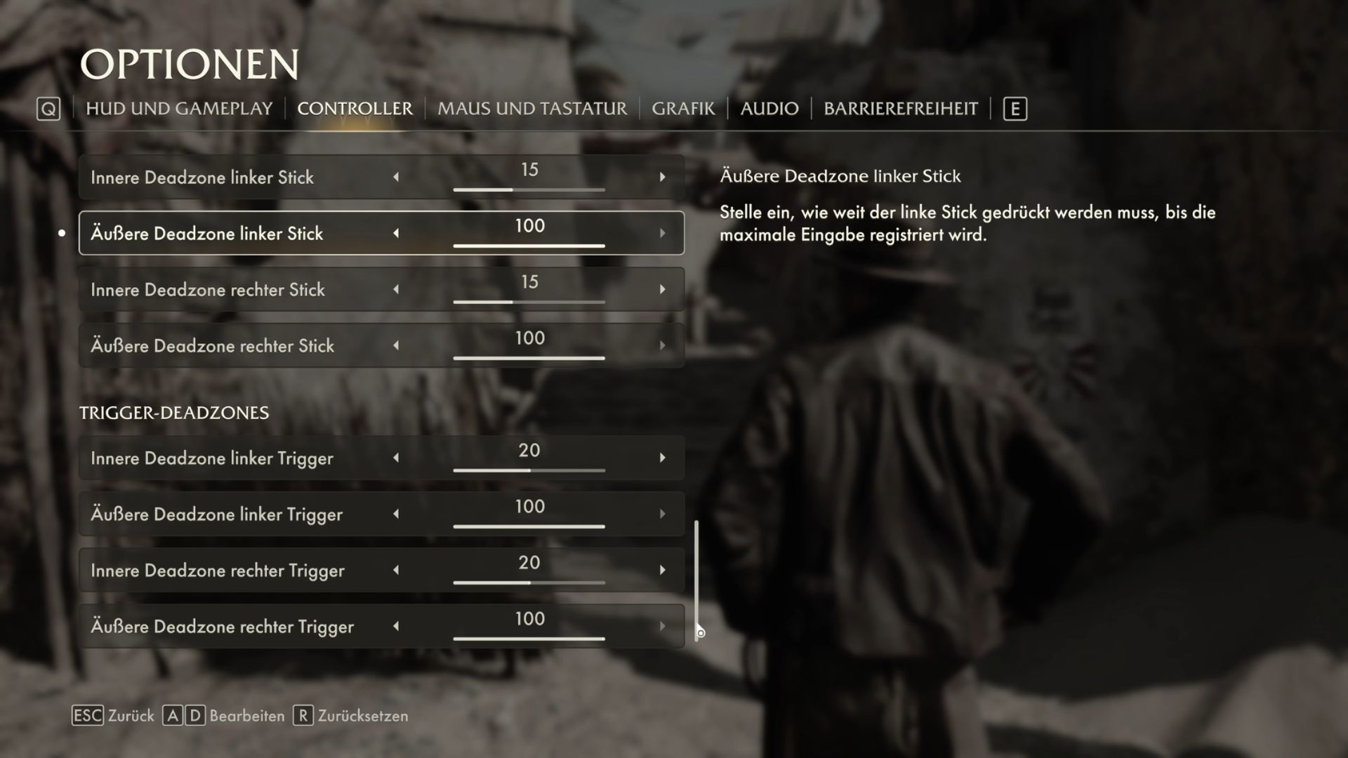 Bei Controller kann die Horizontale Blickempfindlichkeit, die Vertikale Blickempfindlichkeit, die Zielempfindlichkeit, die Zielempfindlichkeit beim Zoomen. die Vibrationsintensität, die Stärke der Zielhilfe, die Innere Deadzone linker Stick, die Äußere Deadzone linker Stick, die Innere Deadzone rechter Stick, die Äußere Deadzone rechter Stick, die Innere Deadzone linker Trigger, die Äußere Deadzone linker Trigger, die Innere Deadzone rechter Trigger und die Äußere Deadzone rechter Trigger eingestellt werden.