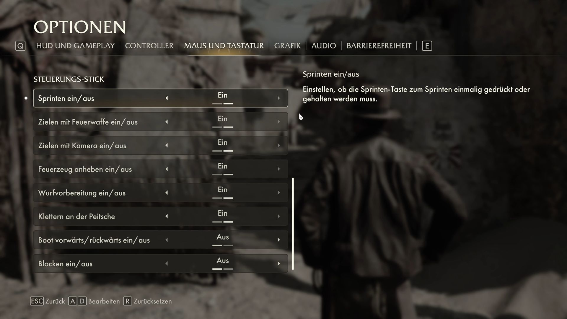 Des Weiteren lässt sich das Sprinten, das Zielen mit Feuerwaffe, das Zielen mit Kamera, das Feuerzeug anheben, die Wurfvorbereitung, das Klettern an der Peitsche, Boot vorwärts/rückwärts und das Blocken umschalten.