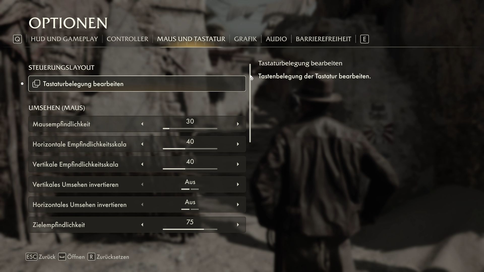 Unter Maus und Tastatur kann die Mausempfindlichkeit, Horizontale Empfindlichkeitsskala, Vertikale Empfindlichkeitsskala und die Zielempfindlichkeit eingestellt werden. Außerdem kann das Vertikale und Horizontale Umsehen invertiert werden.