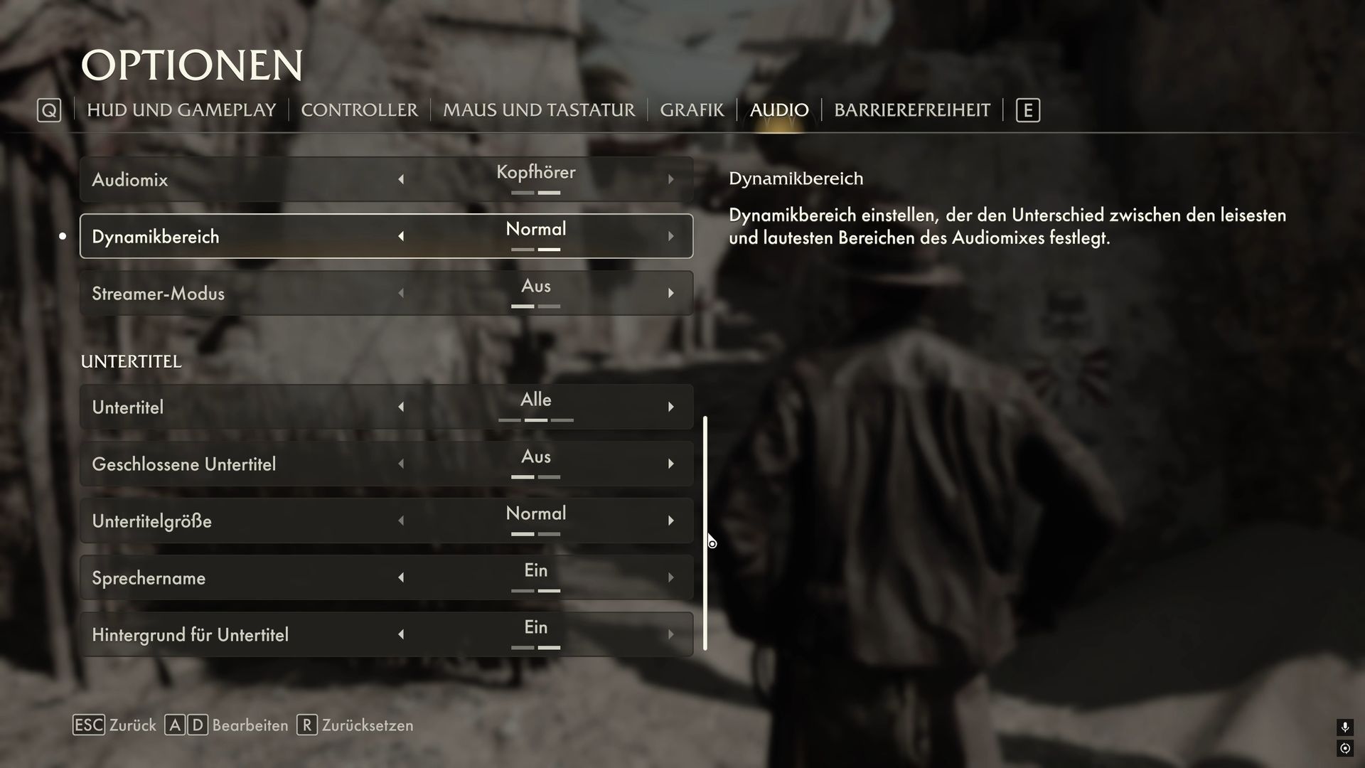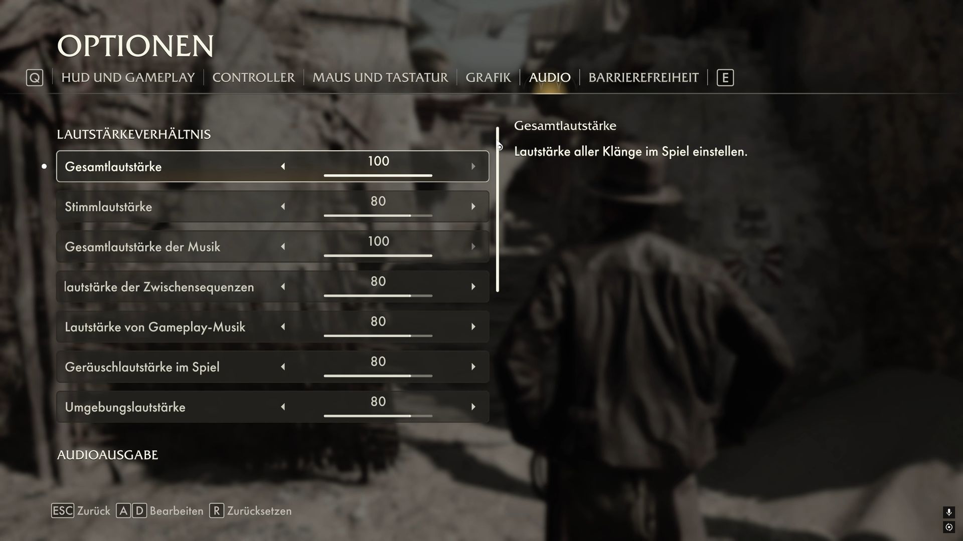 Unter Audio kann die Gesamtlautstärke, die Stimmenlautstärke, die Gesamtlautstärke der Musik, die Lautstärke der Zwischensequenzen, die Lautstärke von Gameplay-Musik, die Geräuschlautstärke im Spiel und die Umgebungslautstärke angepasst werden.