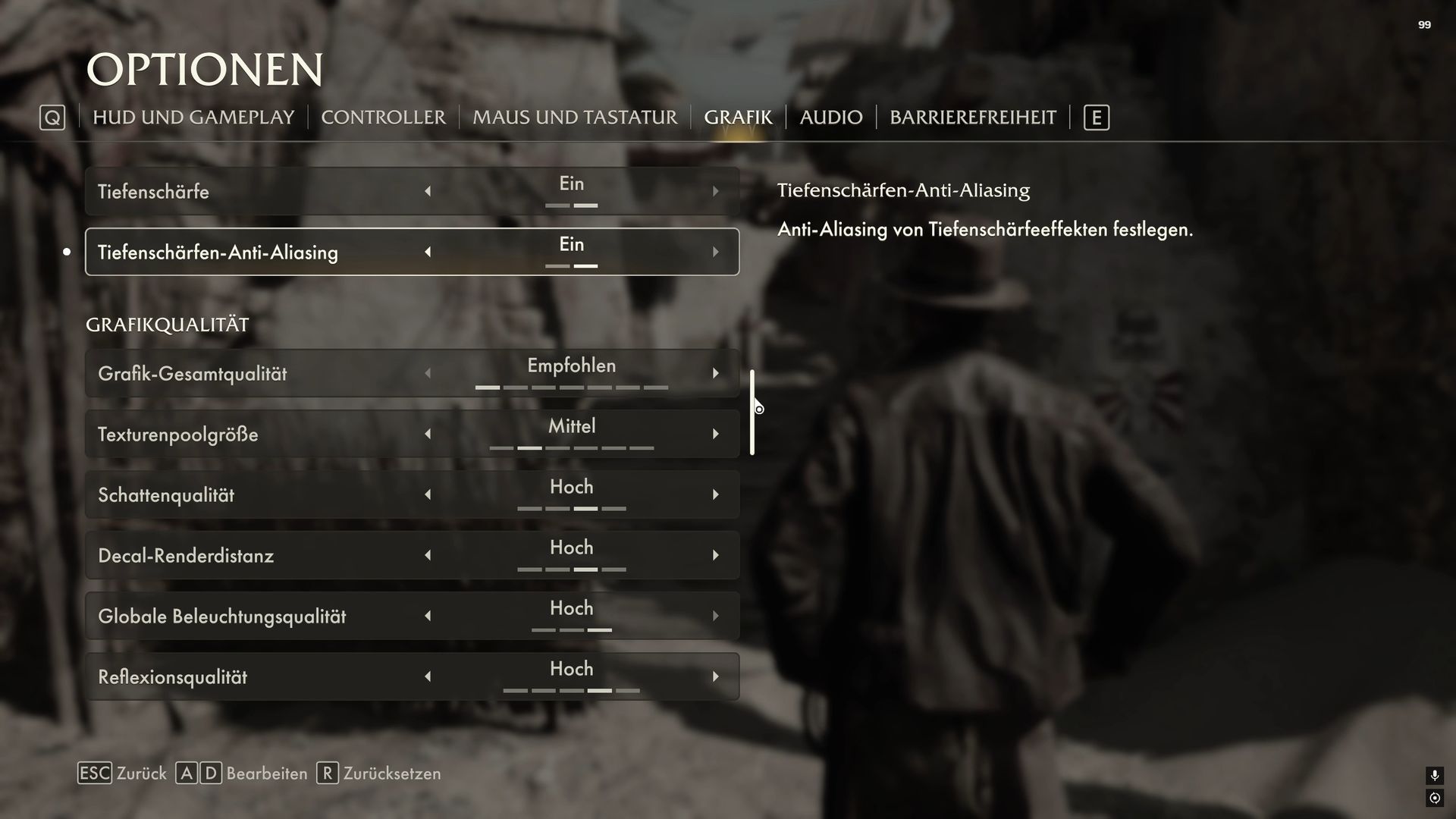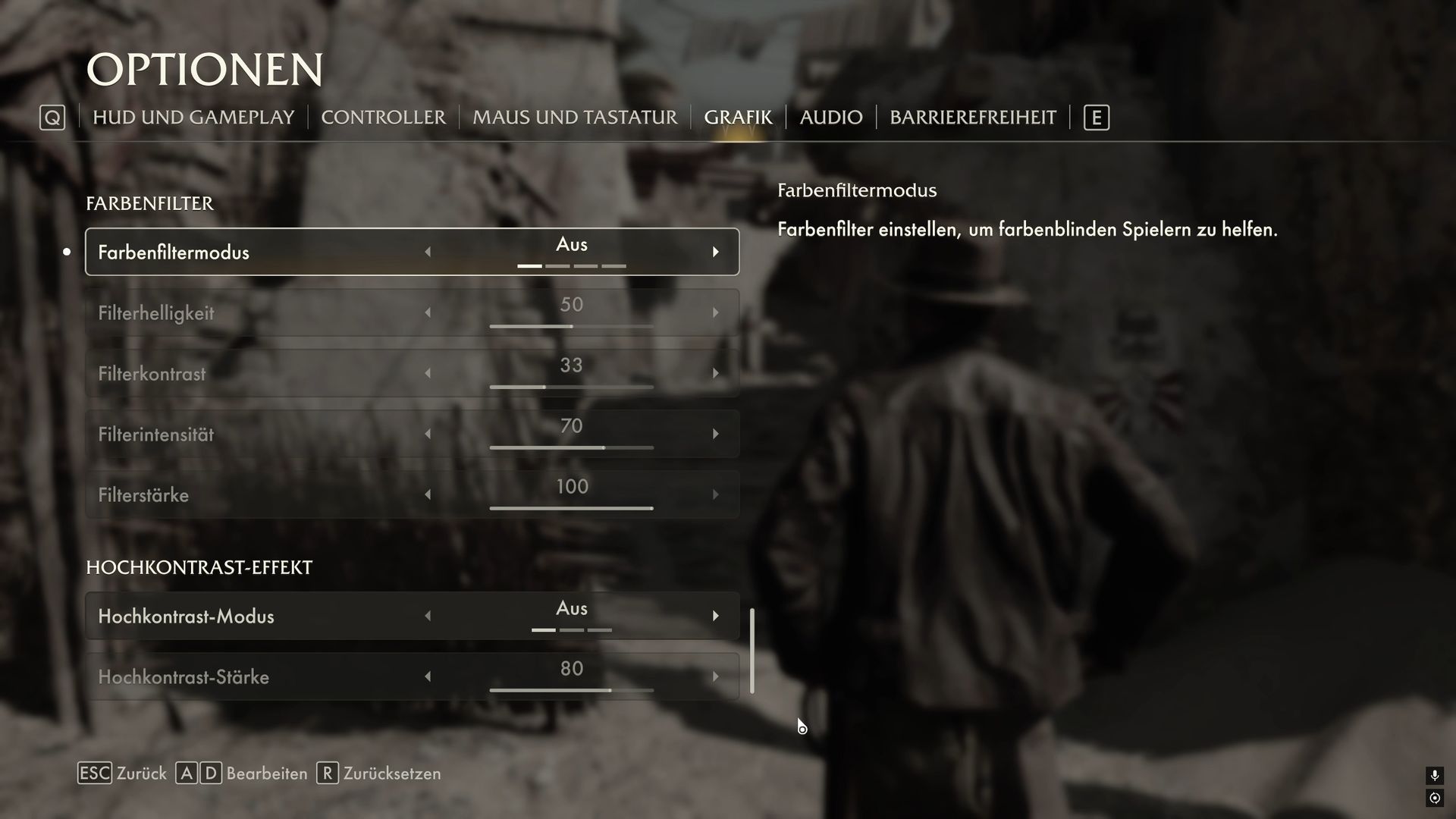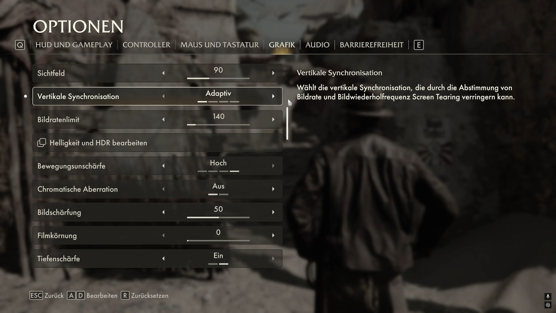 Bei Grafik kann der Anzeigemodus, der Monitor, das Seitenverhältnis, die Auflösung, die Bildeinfassung, der Sicherer Anzeigebereich (HUD), das Sichtfeld, die Vertikale Synchronisation, das Bildratenlimit, die Helligkeit und das HDR bearbeiten, die Bewegungsunschärfe, die Chromatische Aberration, die Bildschärfung, die Filmkörnung, die Tiefenschärfe und Tiefenschärfen-Anti-Aliasing eingestellt werden.