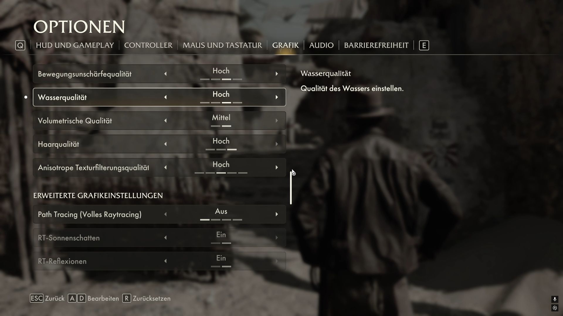 Außerdem kann unter Grafikqualität die Grafik-Gesamtqualität, Texturenpoolgröße, Texturenqualität, Schattenqualittät, Decal-Renderdistanz, Globale Beleuchtungsqualität, Reflexionsqualität, Bewegungsunschärfequalität, Wasserqualität, Volumetrische Qualität, Haarqualität und die Anisotrope Texturfilterungsqualität eingestellt werden.