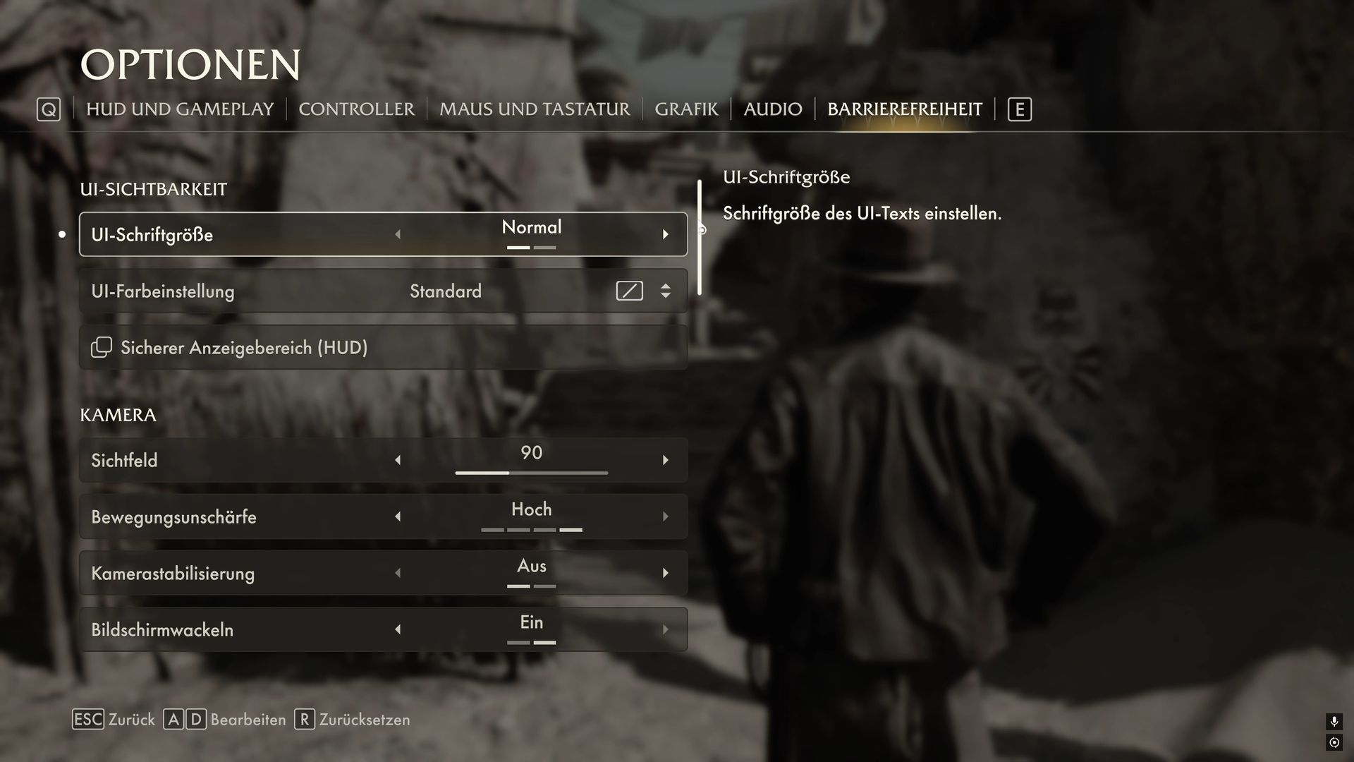 In den Barrierefreiheit-Einstellungen kann unter UI-Sichtbarkeit, die UI-Schriftgröße, die UI-Farbeinstellung und der Sicherer Anzeigebereich (HUD) eingestellt werden.