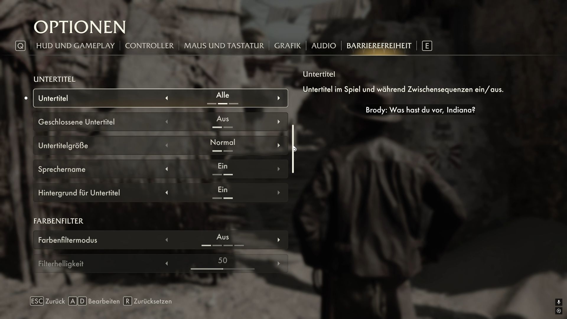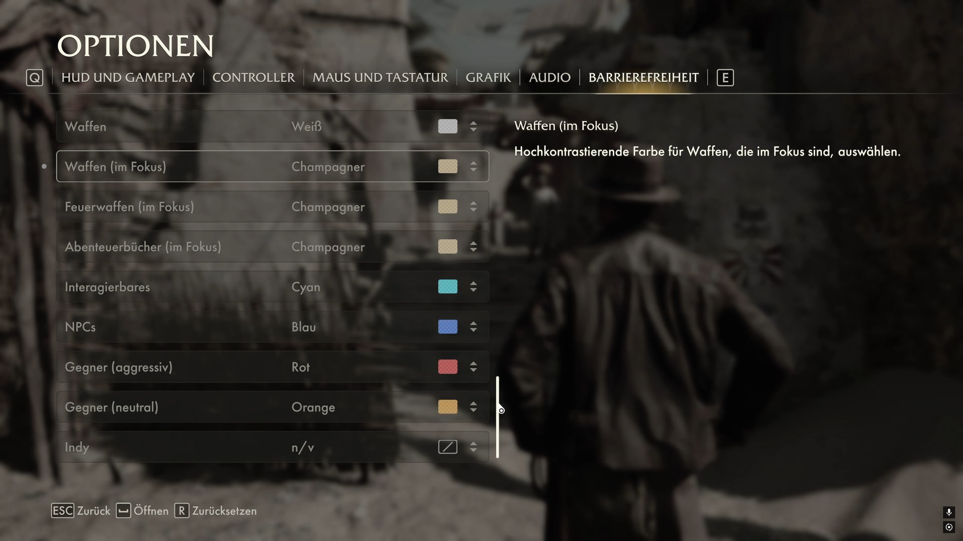Zum Schluss können noch die Hochkontrastierende Farben für Gegenstände, Gegenstände (im Fokus, Waffen, Waffen (im Fokus), Feuerwaffen (im Fokus), Abenteuerbücher (im Fokus), Interagierbares, NPCs, Gegner (aggressiv), Gegner (neutral) und Indy eingestellt werden.